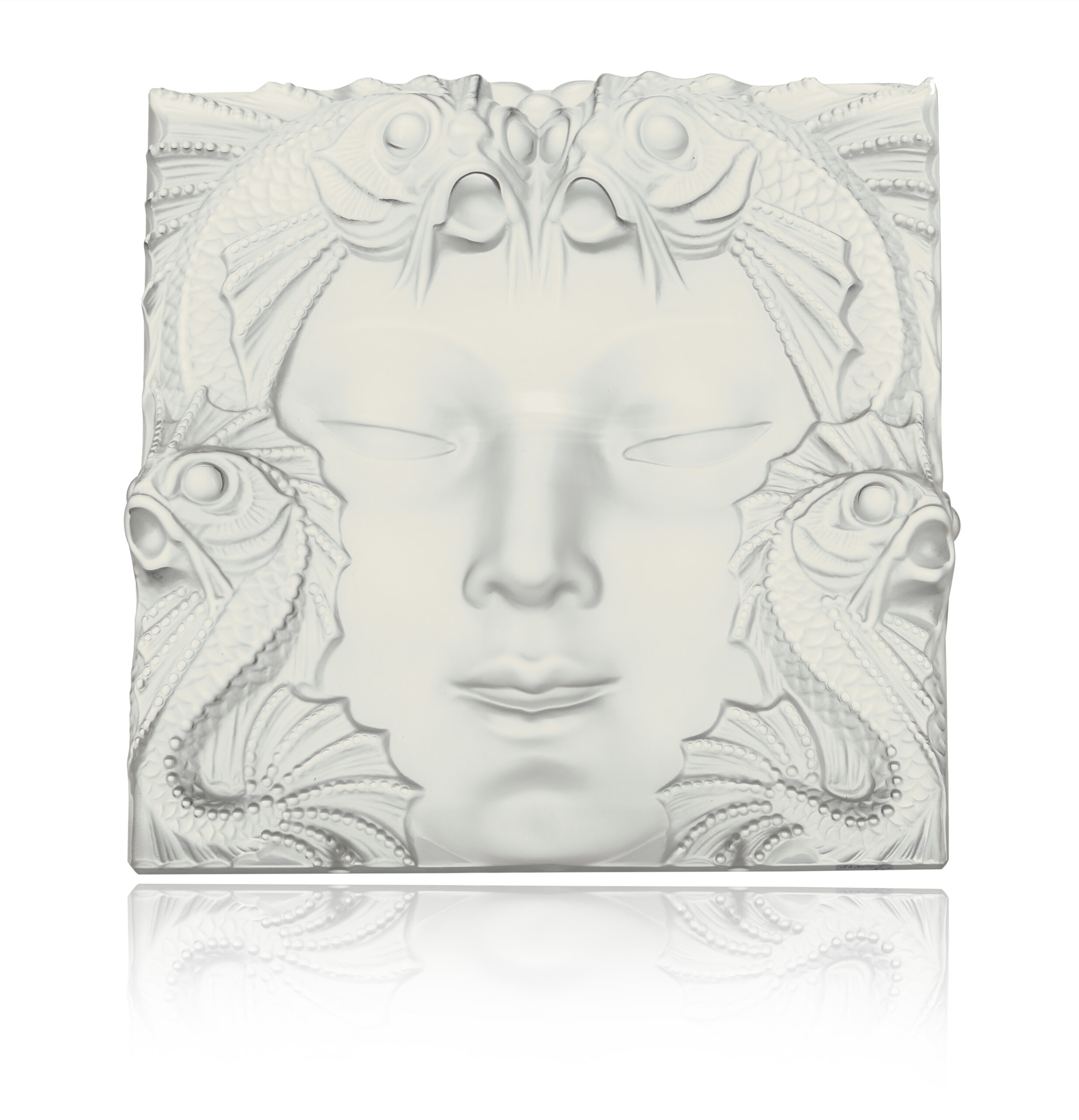 Moulded glass depicting a woman's face flanked by fish, after a model created in 1935 and reproduced in 1951