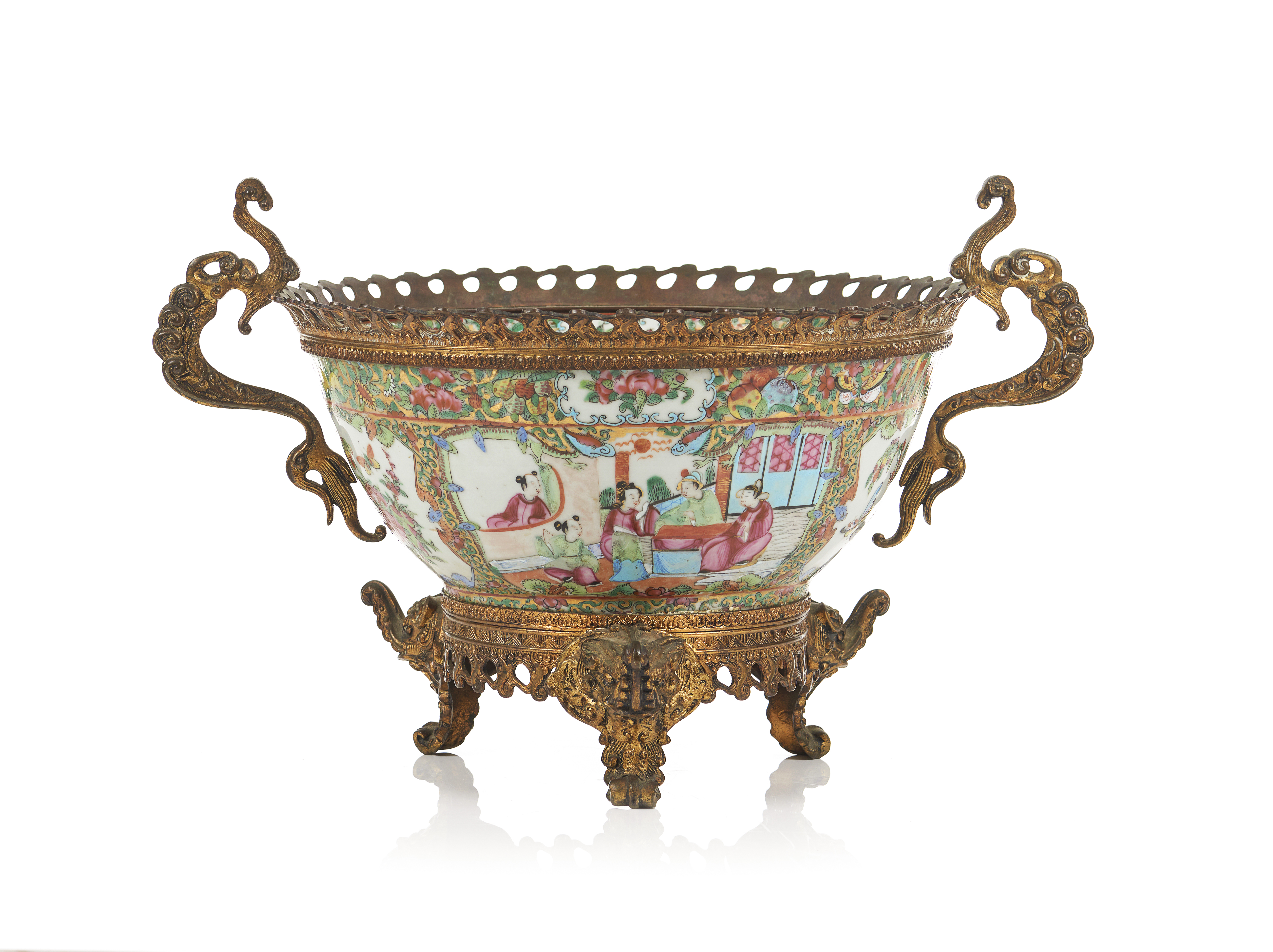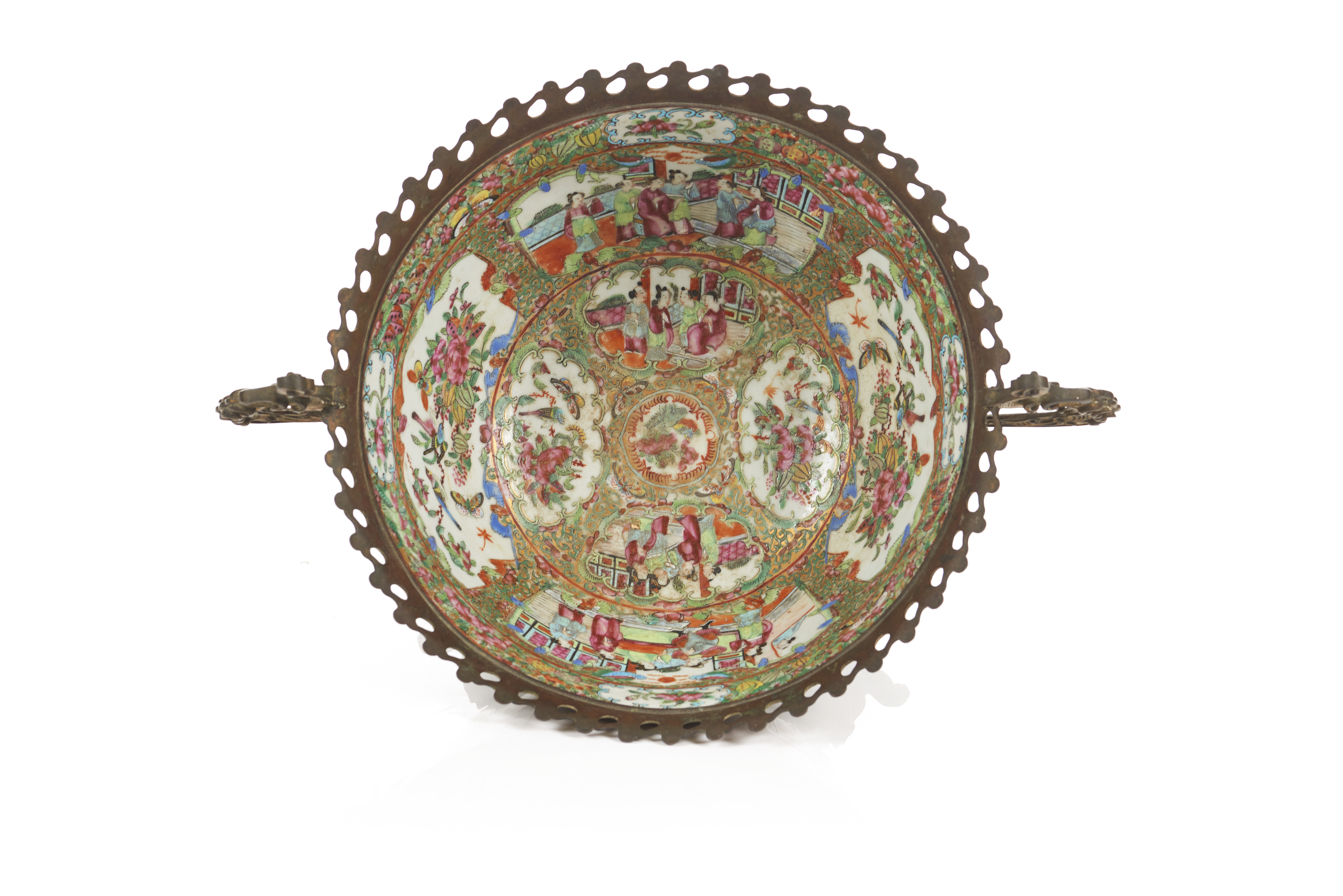 Polychrome "Famille Rose" enamelled decoration of terrace with figures, floral motifs, fruits, birds and insects, said 'Canton'