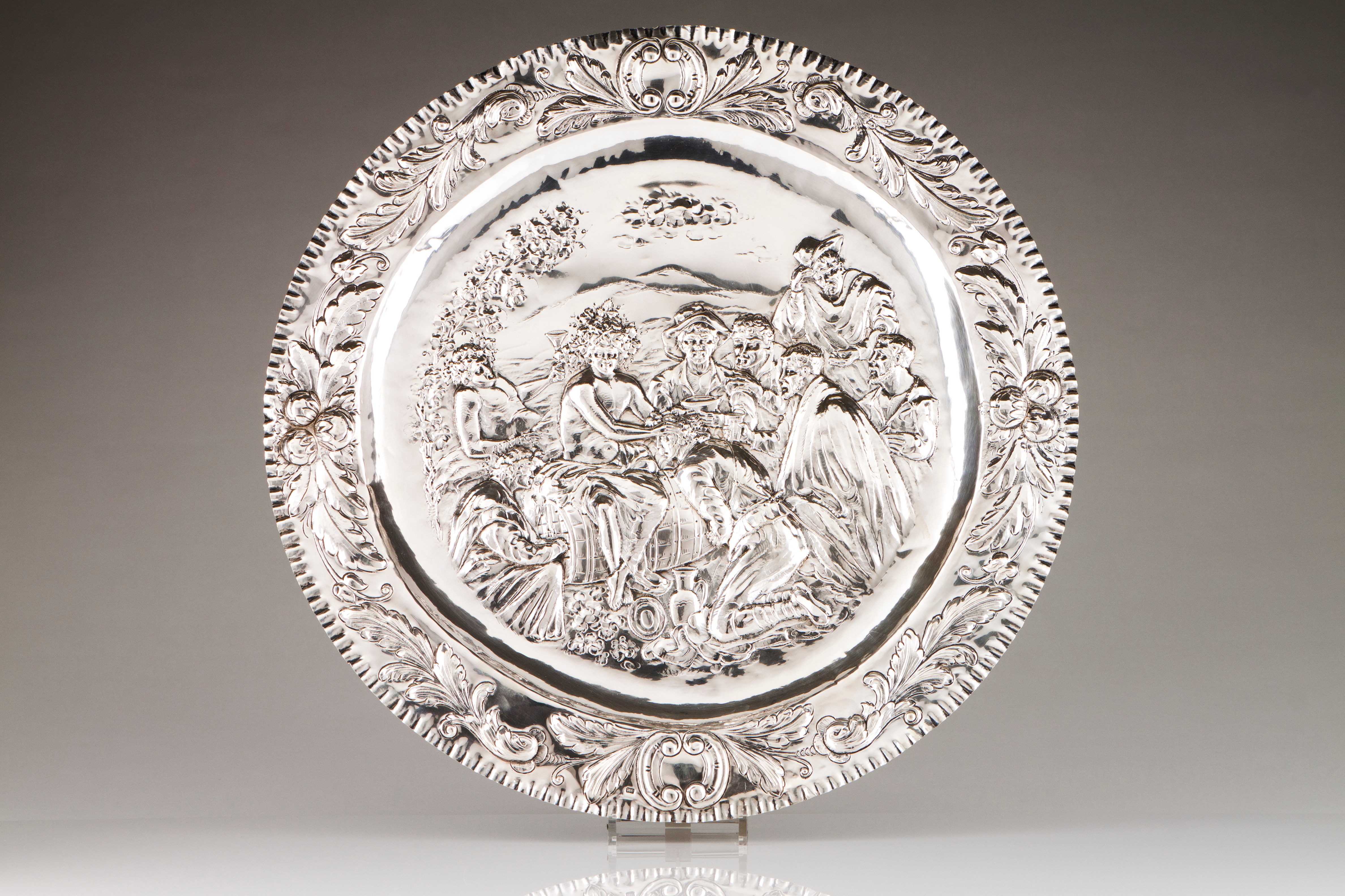 Silver with embossed and chiselled decoration with floral motifs in the baroque manner and centre representing male figures and Bacchus
