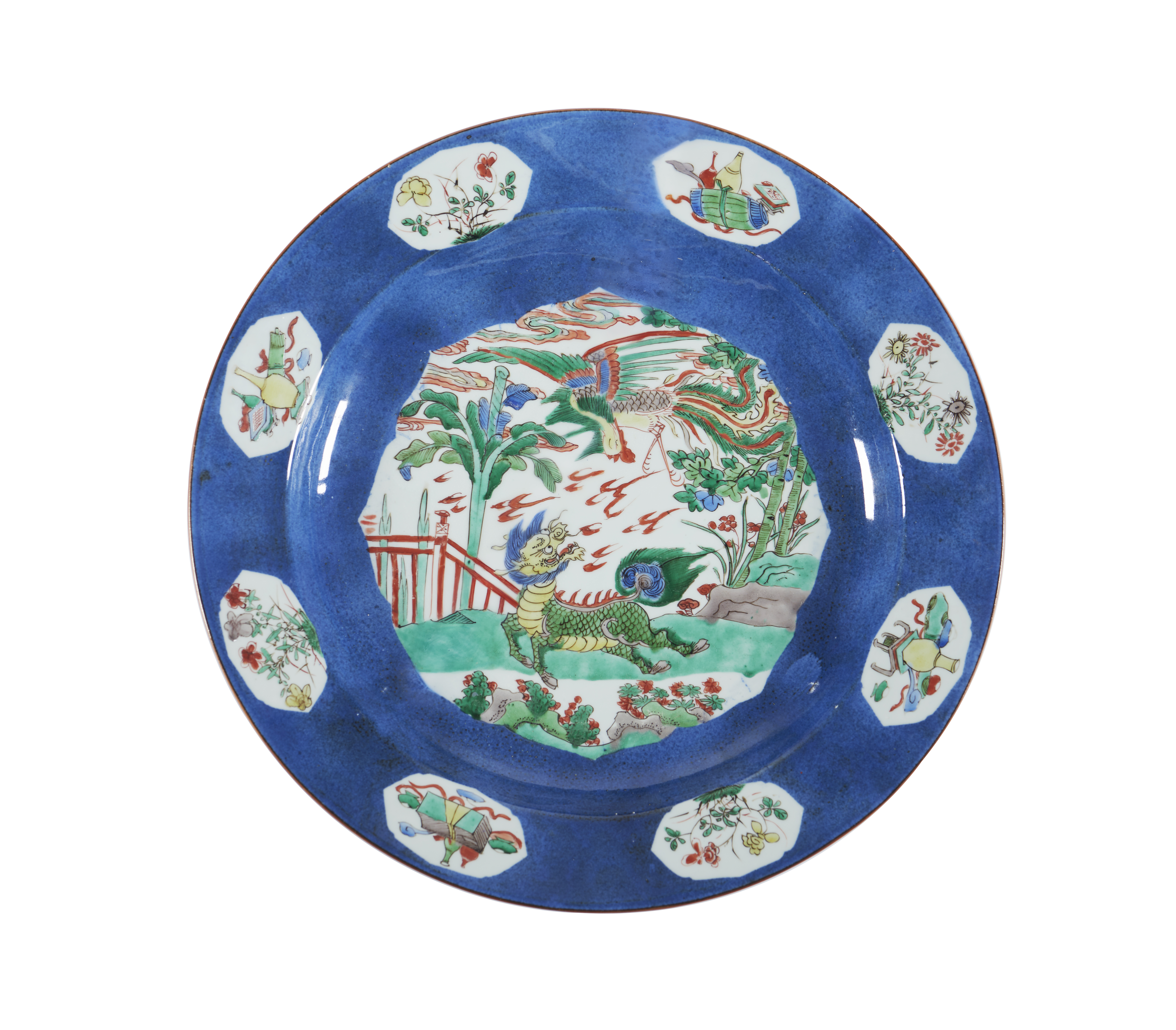 Decorated with a central panel featuring a garden scene with a qilin and a phoenix. The rim decorated with eight panels enclosing floral motifs and precious objects. The reverse is decorated with flowers. Marked on the base.