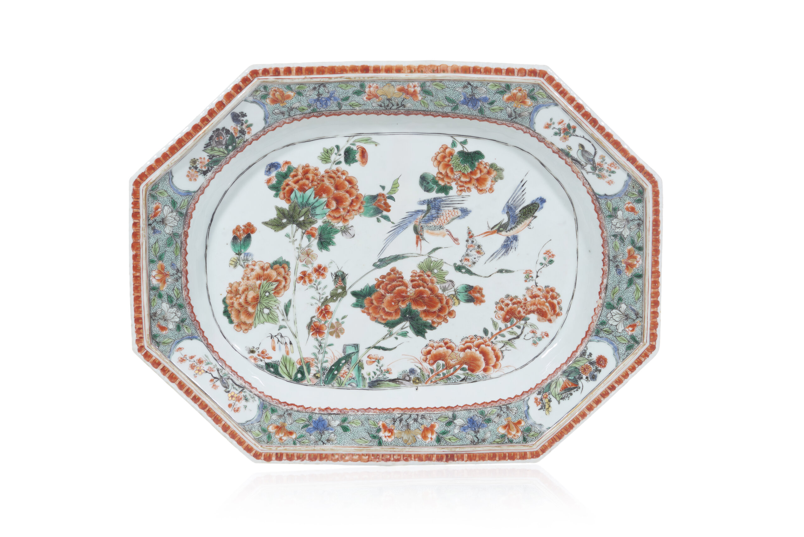 A large octagonal Chinese export porcelain platter with Famille Verte decoration