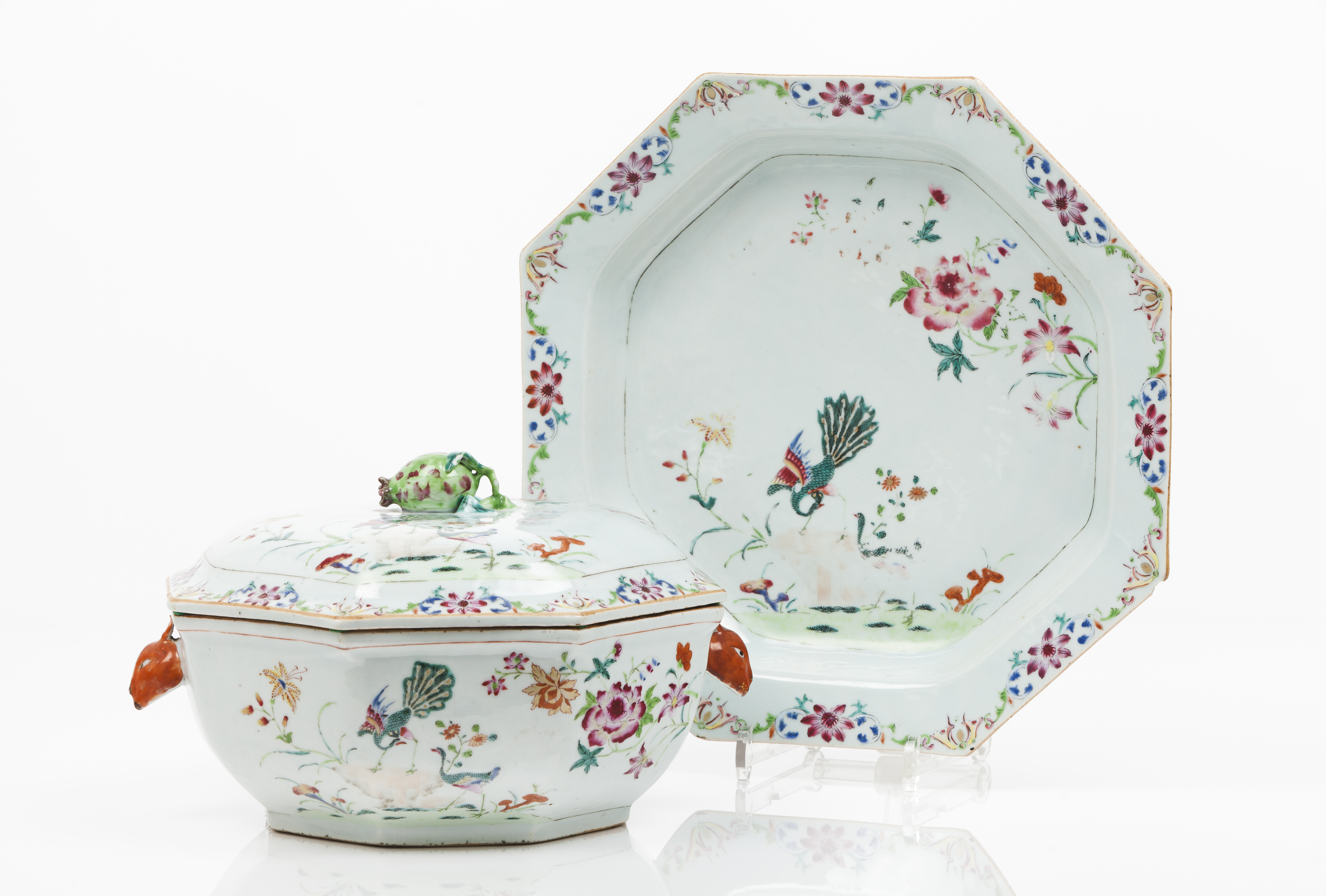 Polychrome "Famille Rose" enamelled decoration of garden view with peacocks, flowers and rocky outcrops