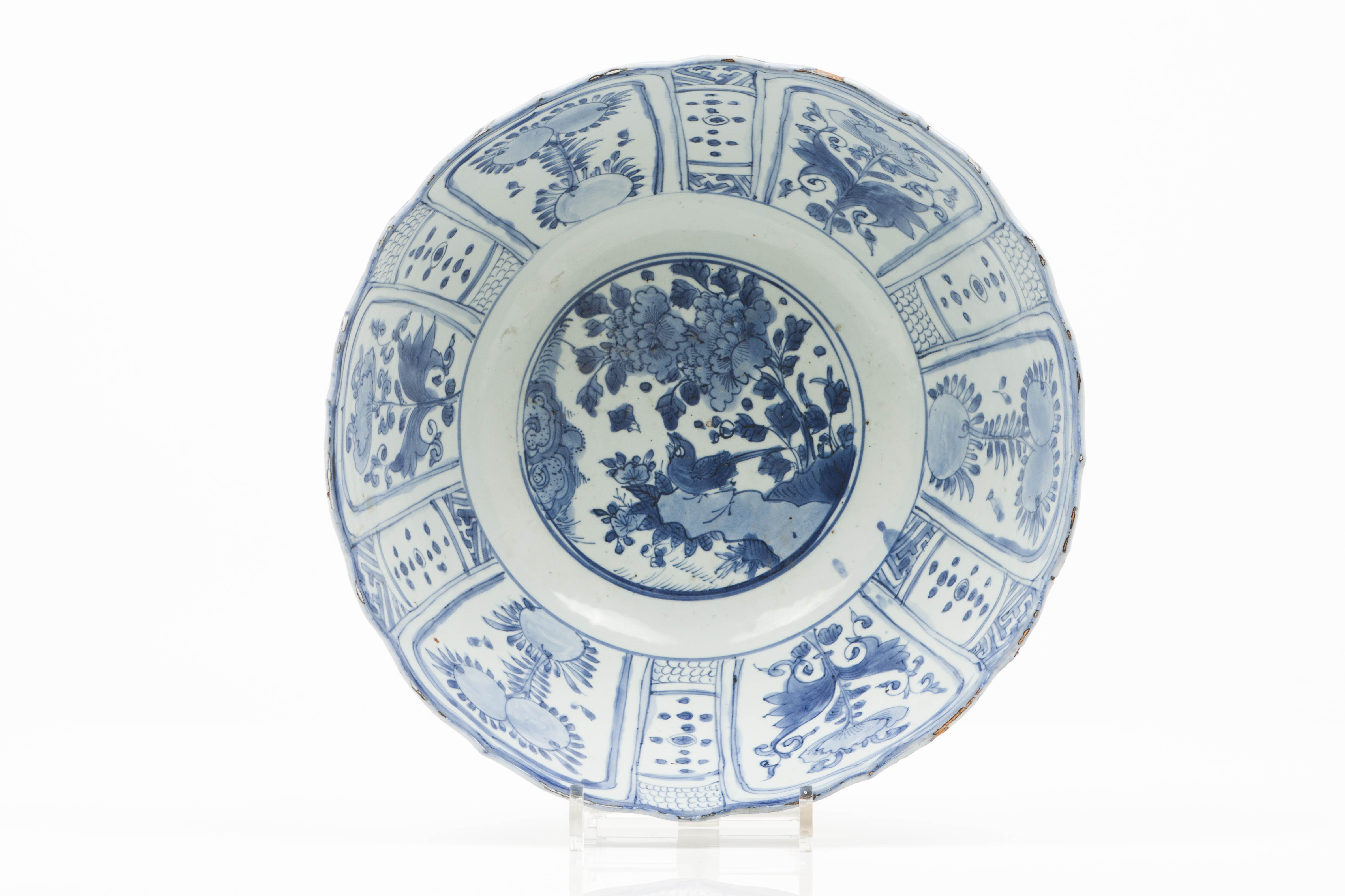 Blue underglaze decoration of central landscape with rock, flowers and birds