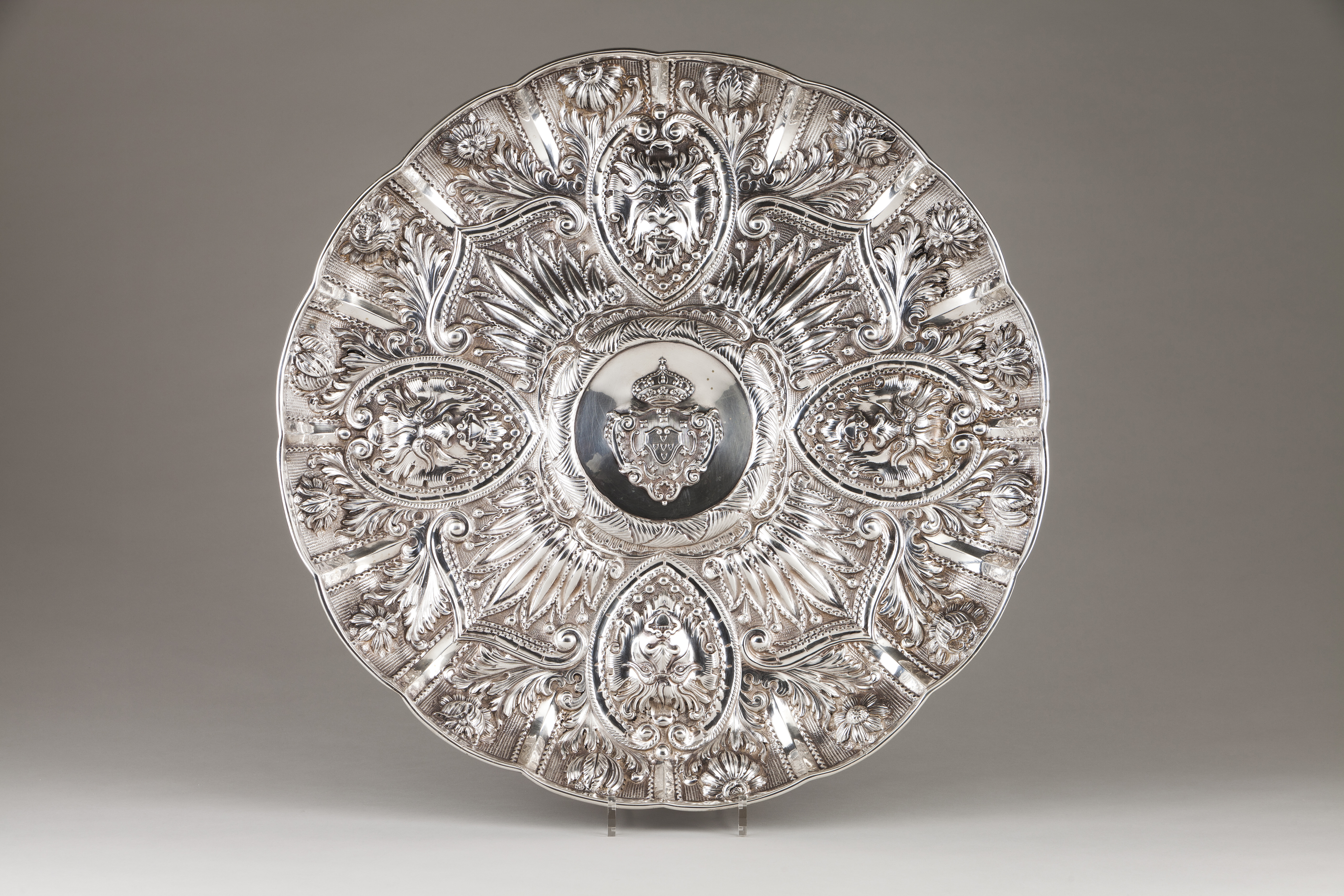 Central Portuguese royal arms with repousse lip of foliage, volutes, flowers and classical mask decoration