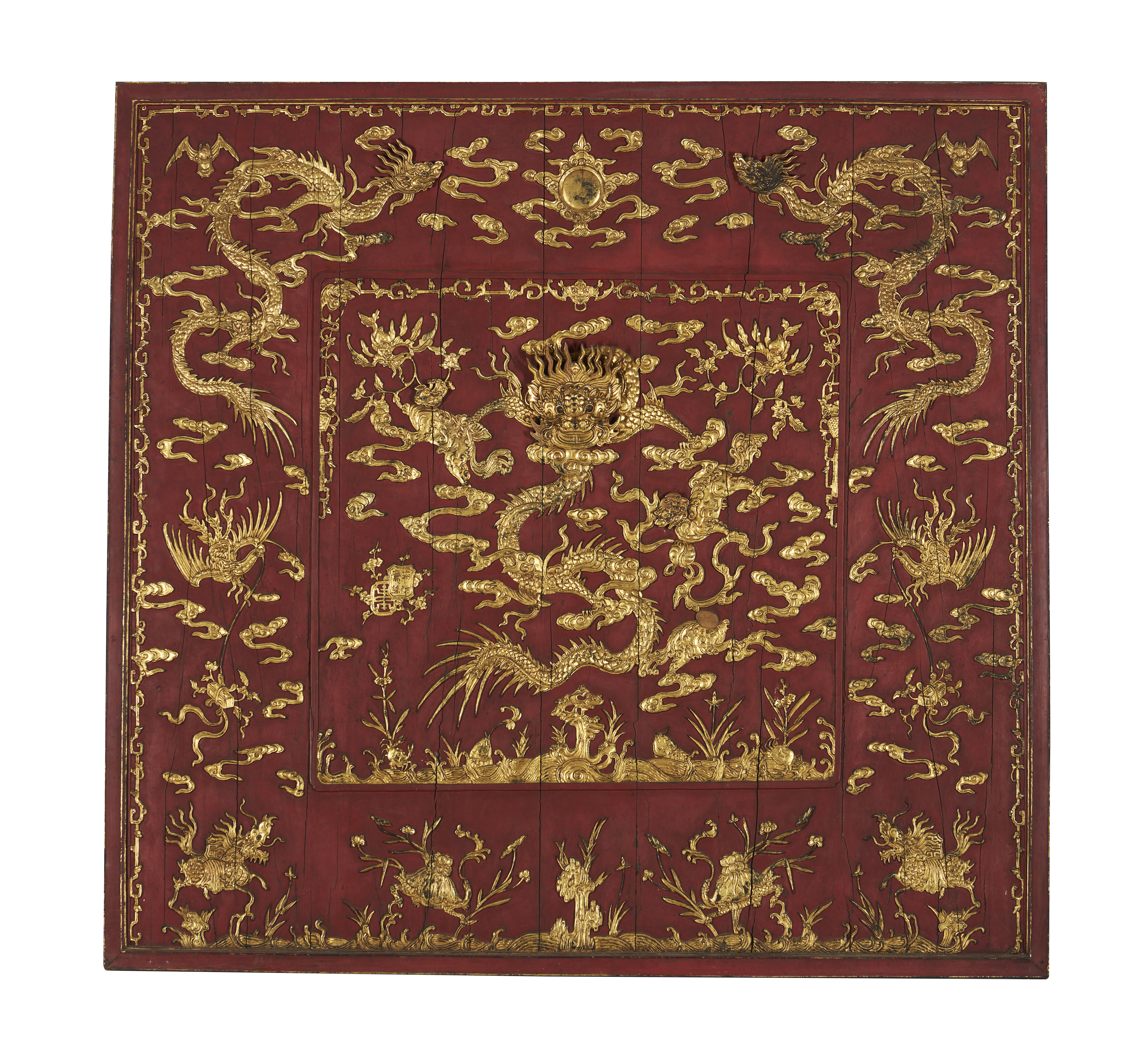 With carved and gilt on a red painted background depicting dragons and other mythical beasts amidst clouds and flames