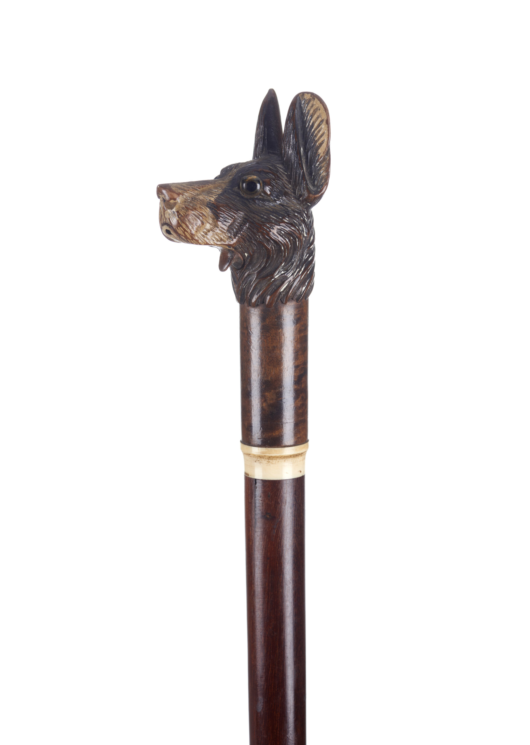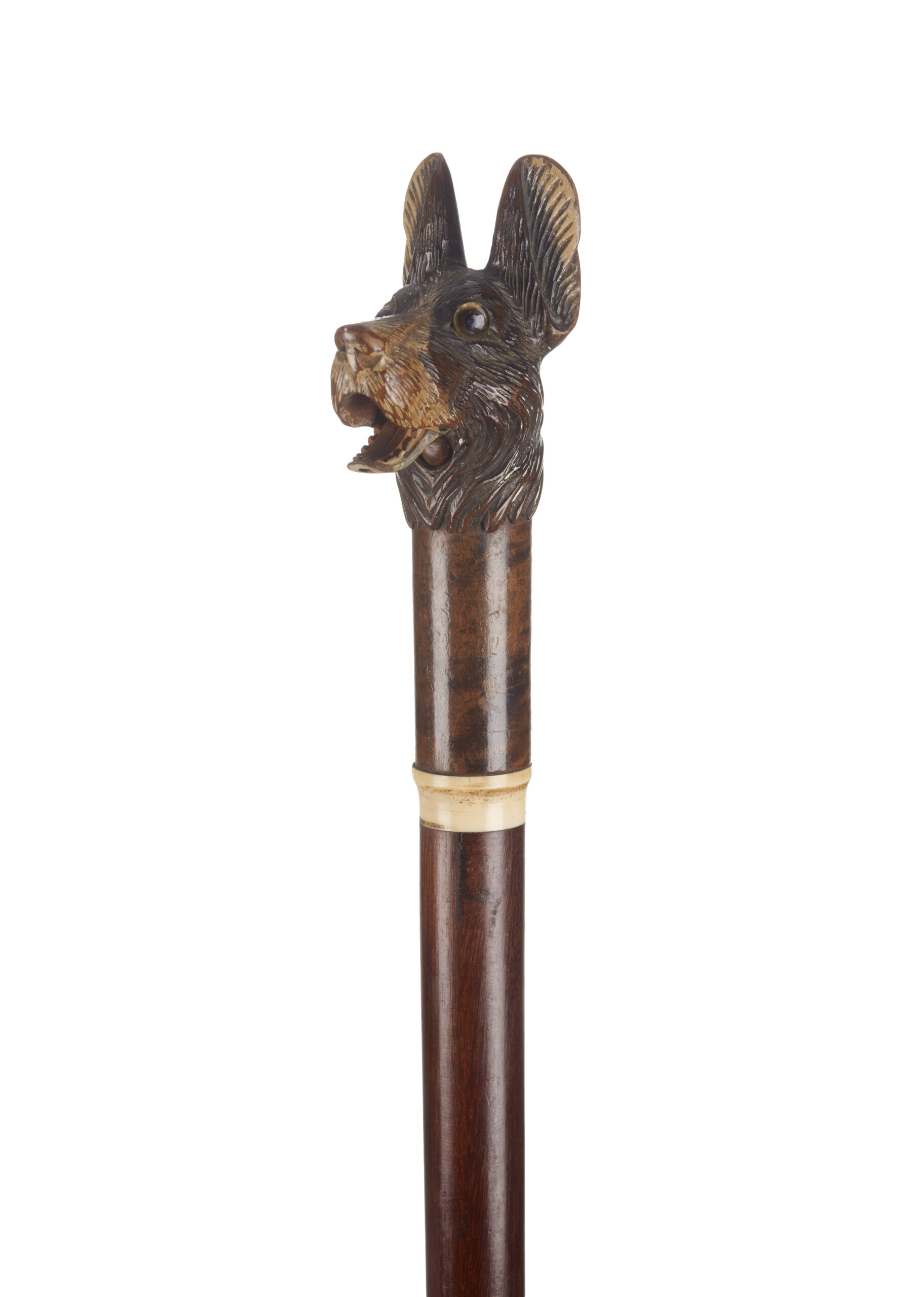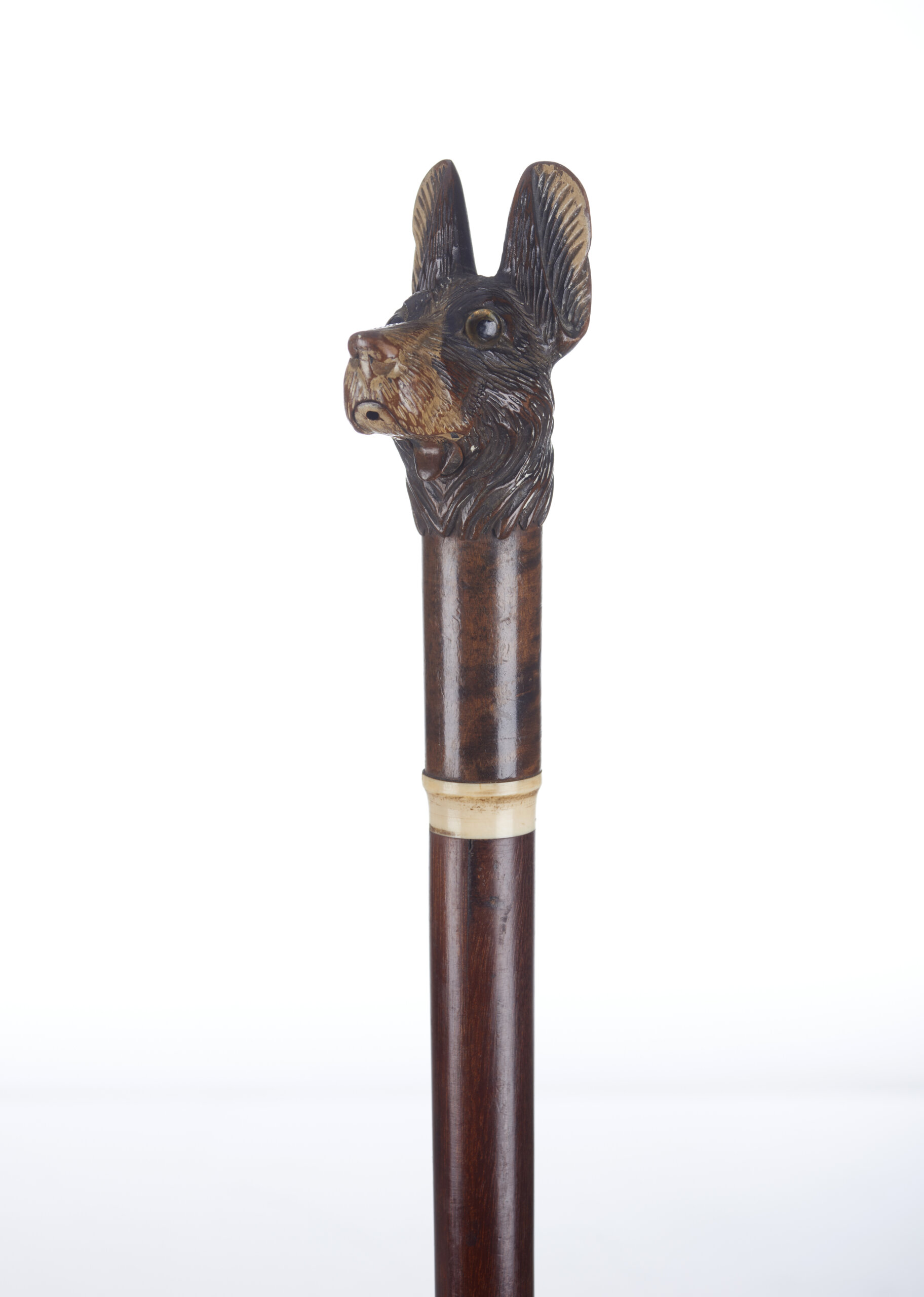 Lignum vitae shaft, surmounted by a carved walnut pommel representing a dog's head with applied glass eyes, mouth with functional spring mechanism and ivory ferrule