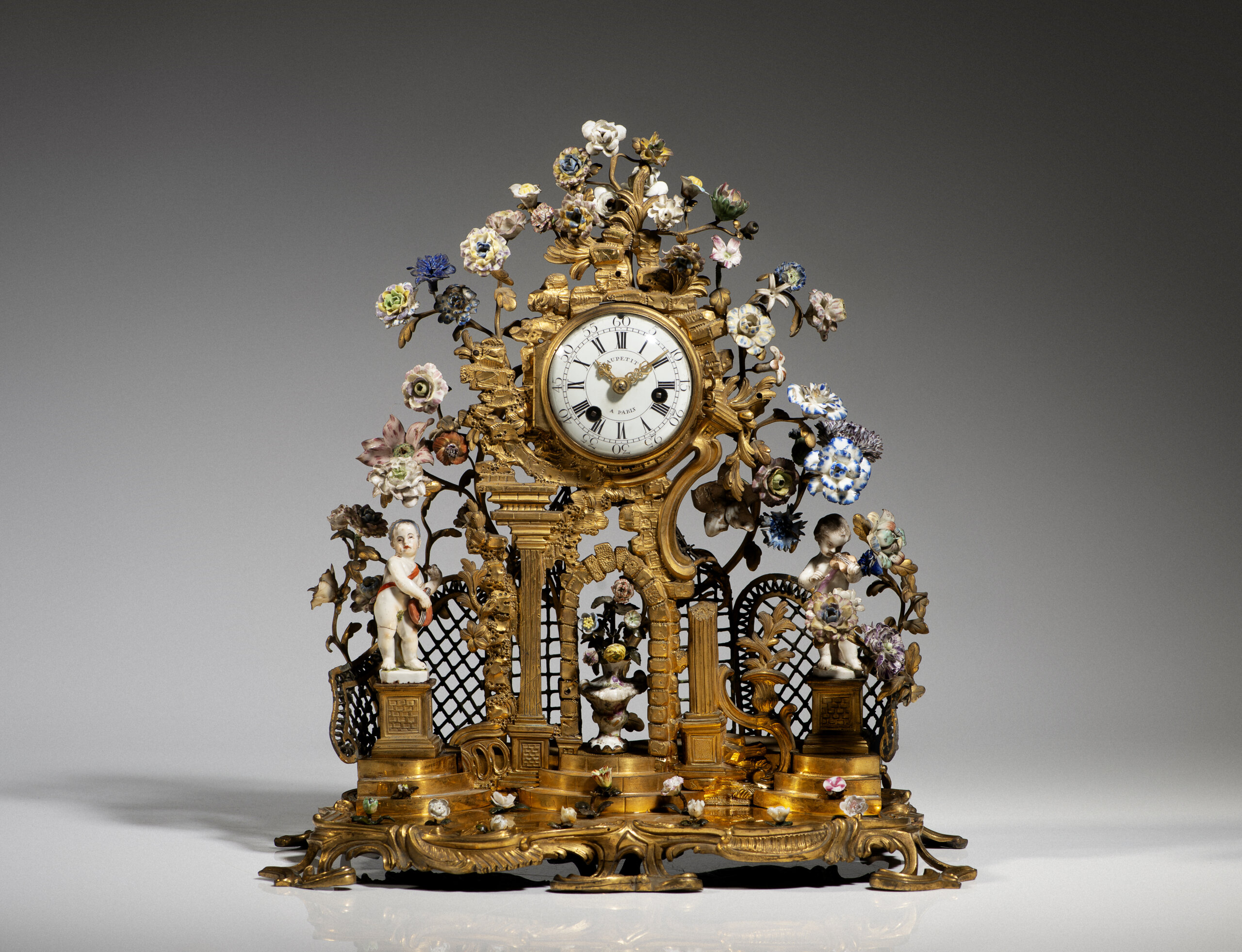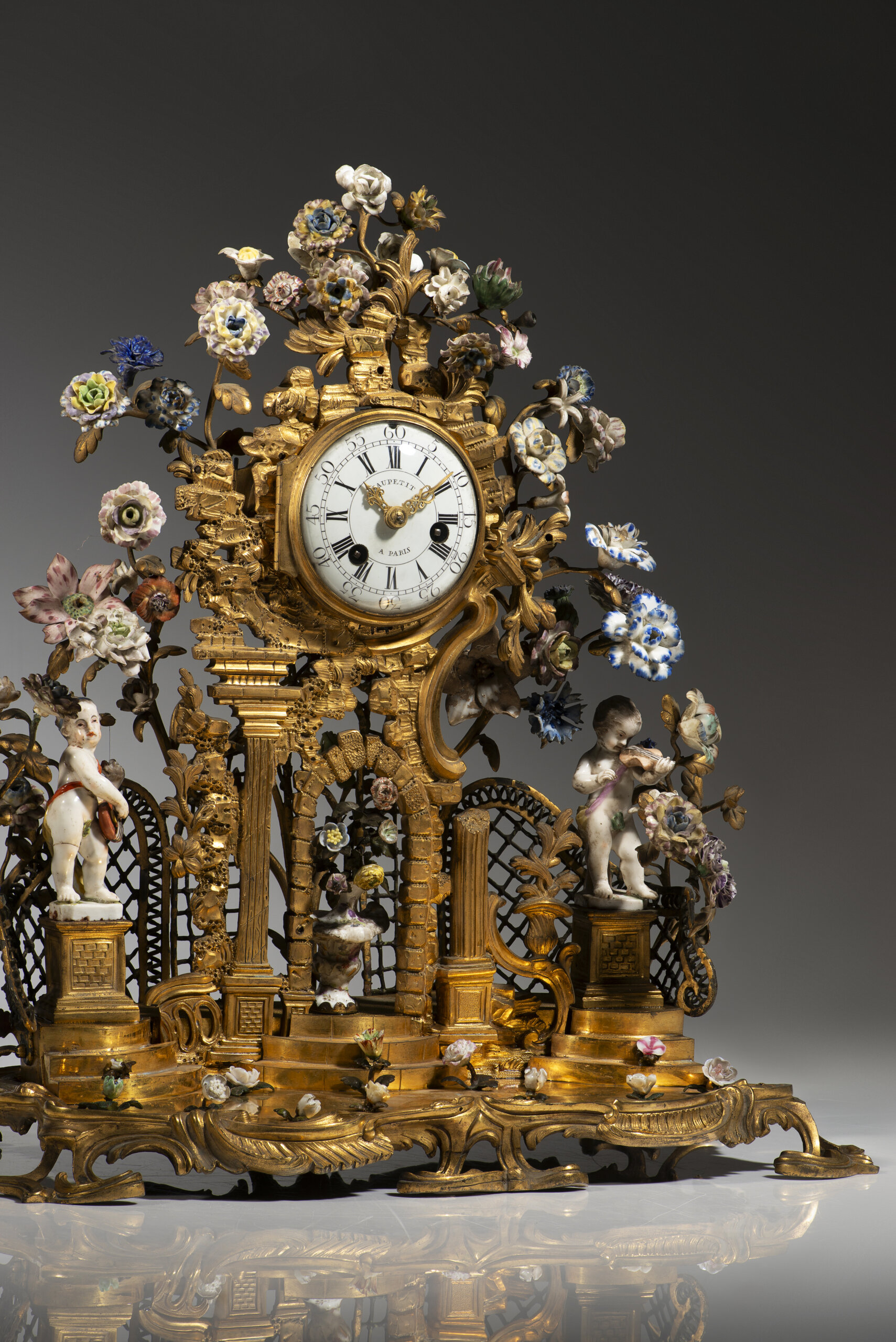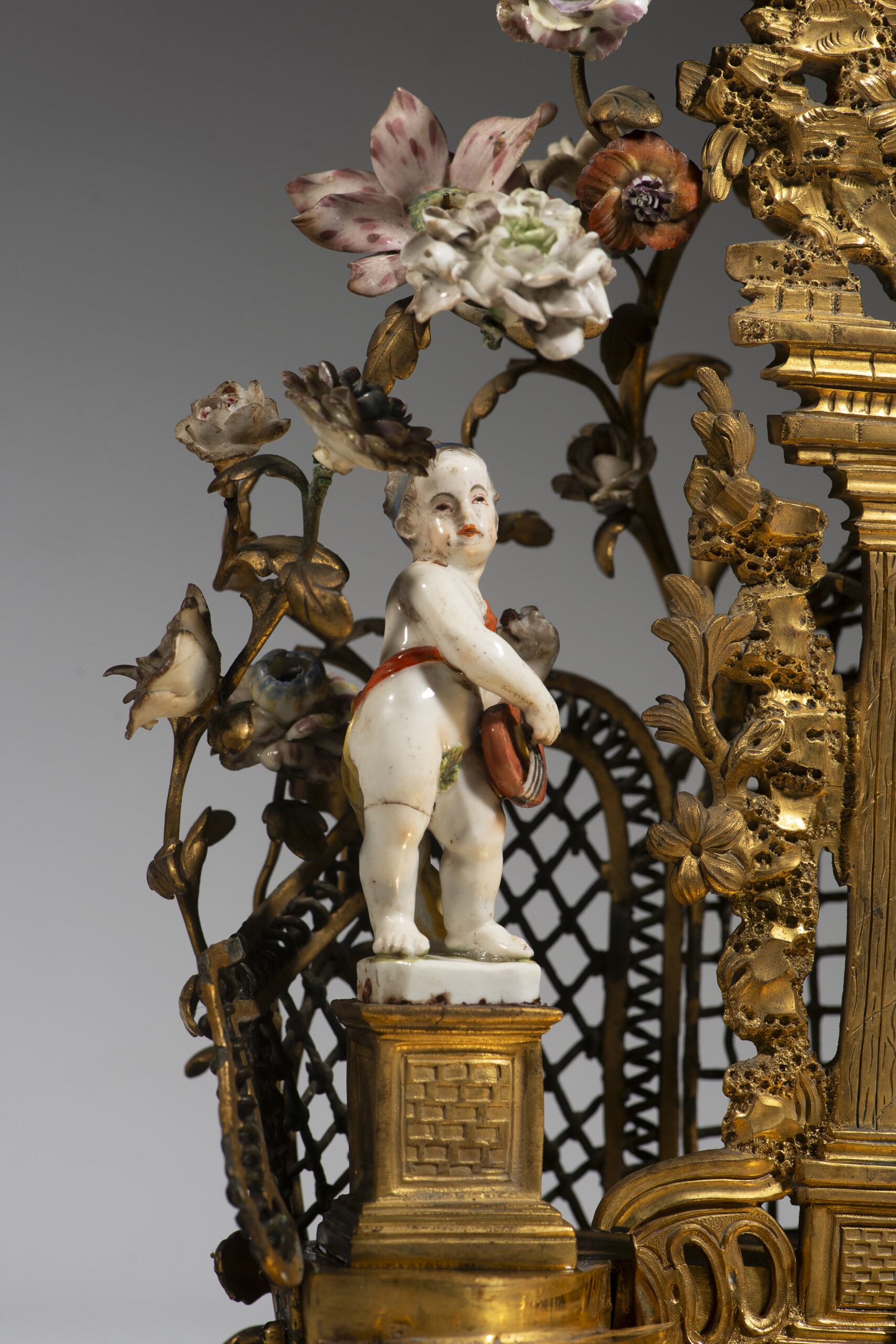 Gilt and chiseled bronze, modelled as an architectural ruin with columns, arch and trelliswork, flanked by two porcelain putti on plinths, surrounded by branches with polychrome porcelain flowers