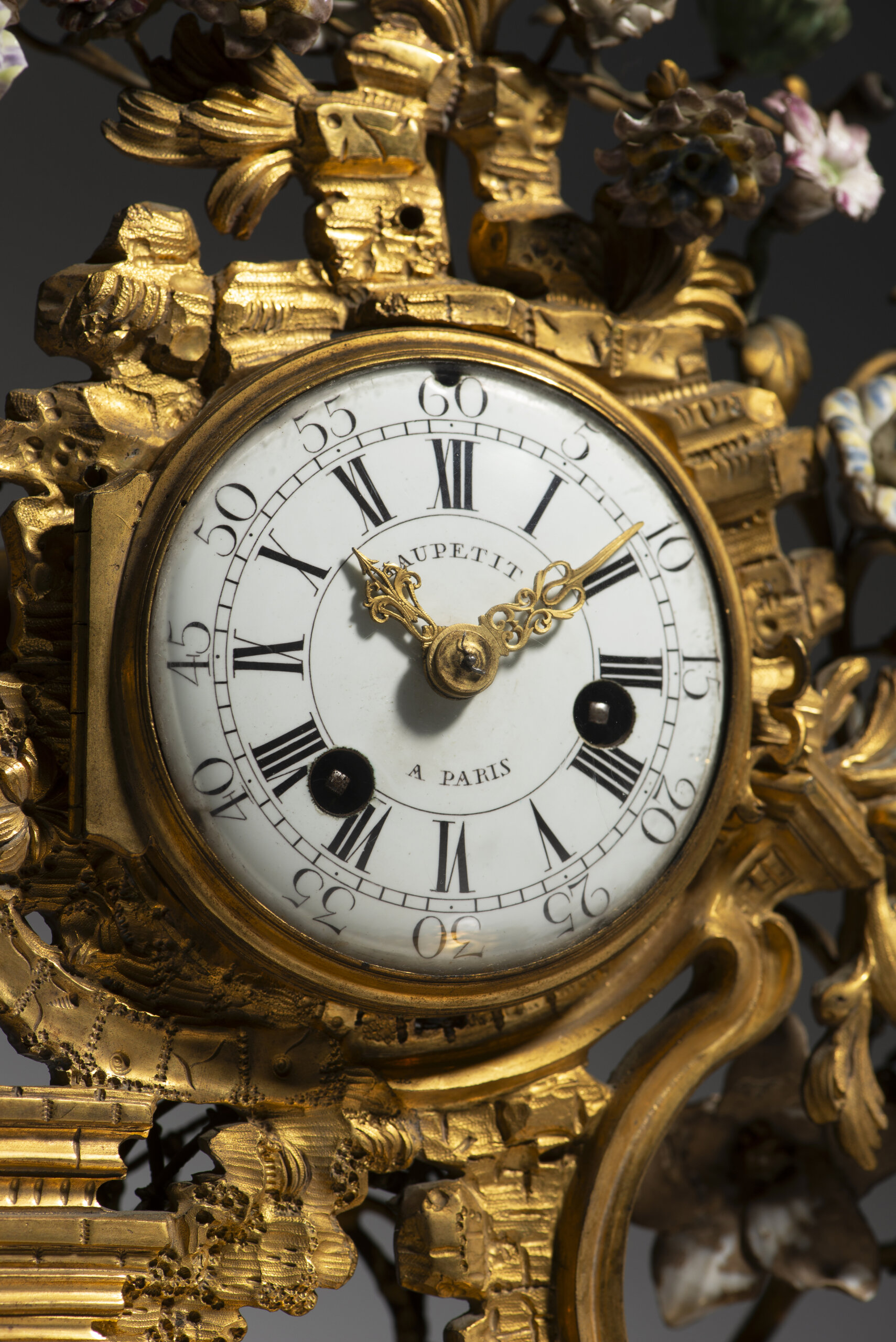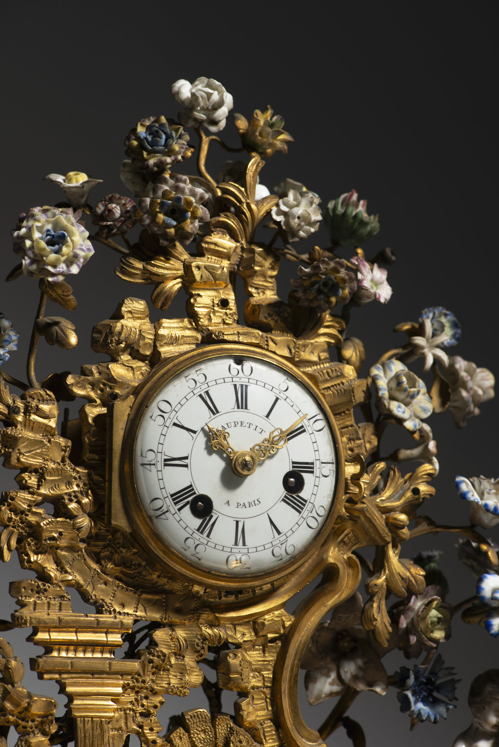 A Louis XV gilt bronze and porcelain mantel clock by Jacques-François Maupetit