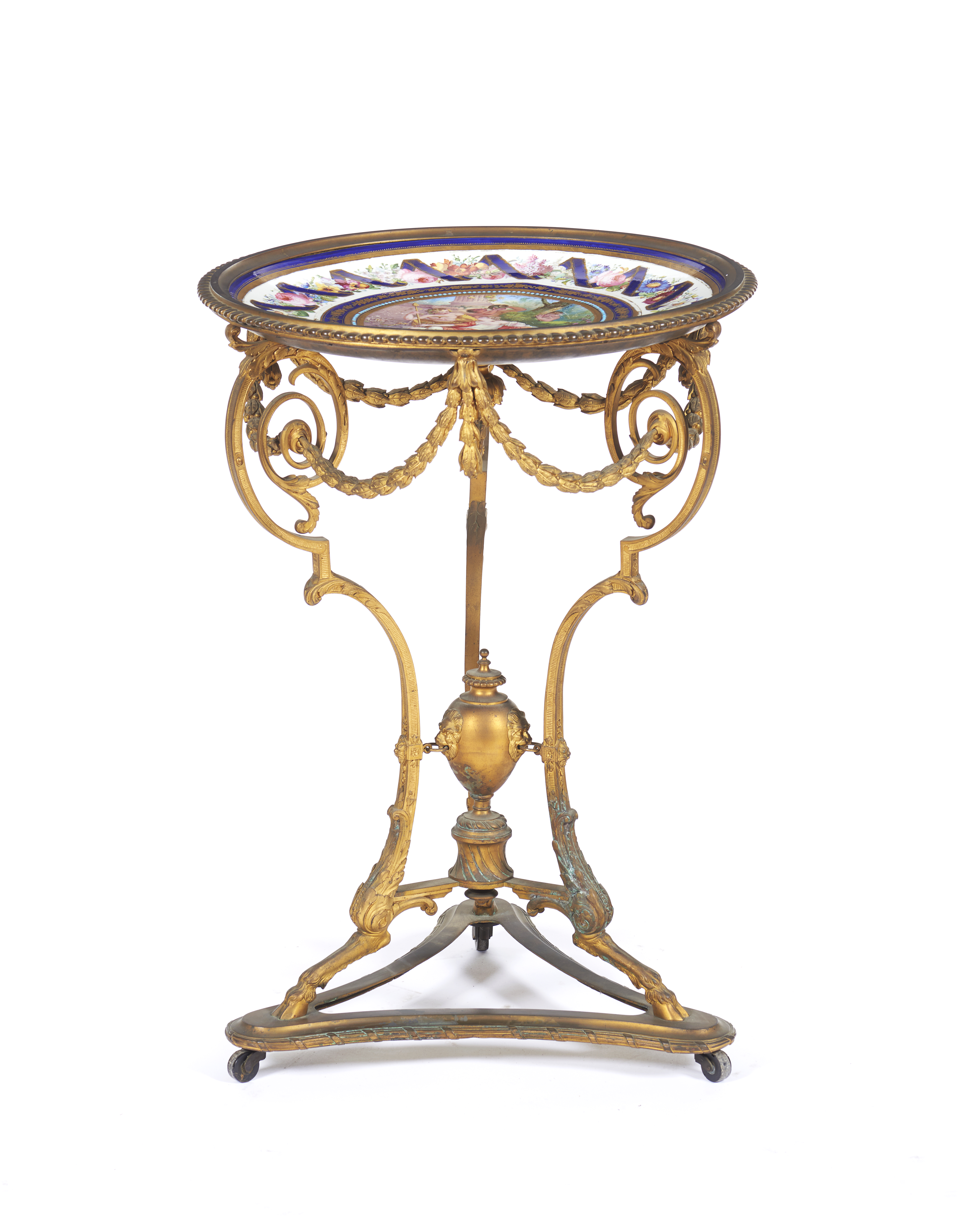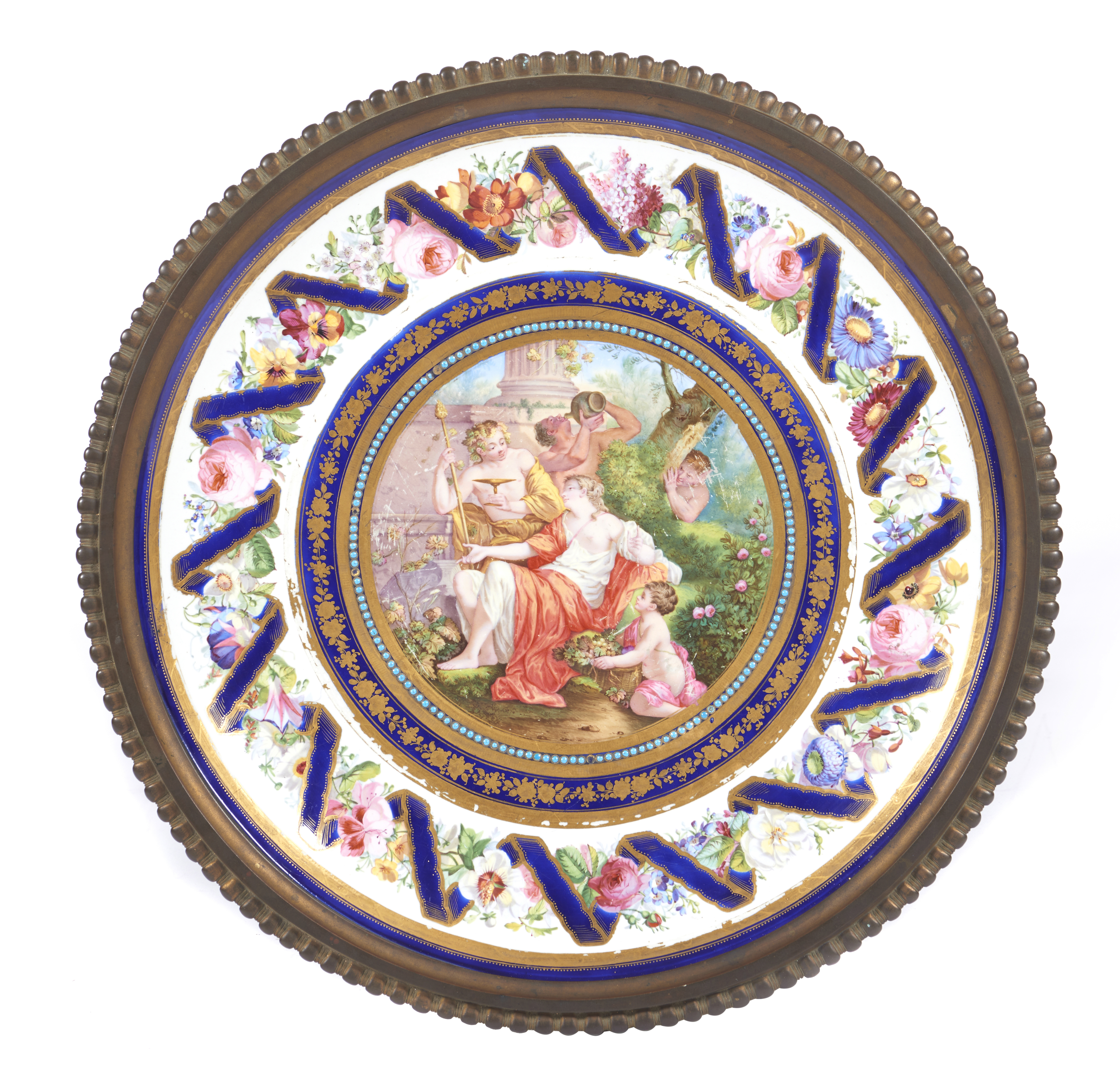 Porcelain top of gilt and polychrome decoration with central mythological scene, possibly Dionisius and Ariadne, framed by flower garlands