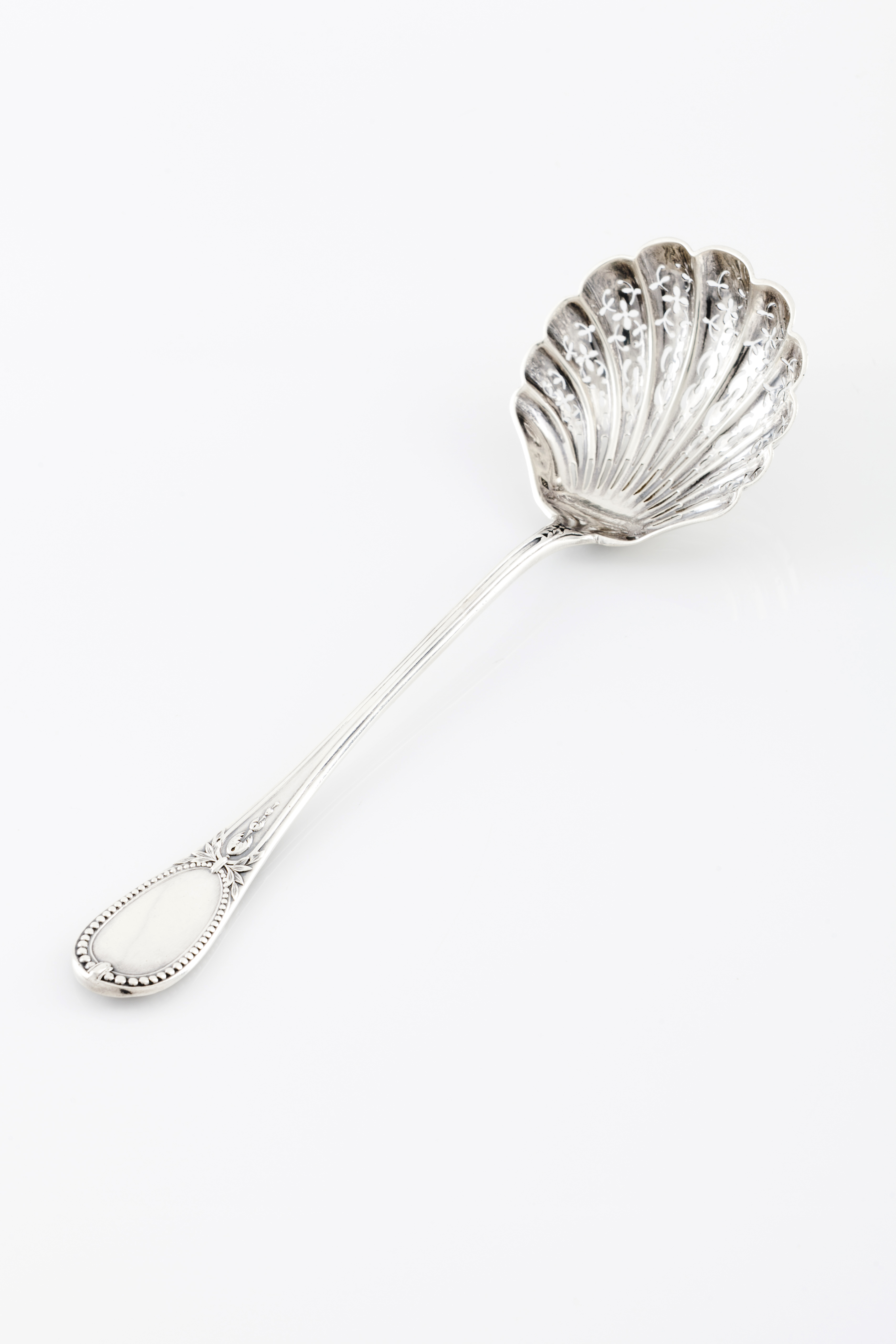 Laurels, ribbon, beaded medallions and acanthus leaves decoration. The shell shaped bowl of pierced floral and foliage motifs. Engraved CL troubadour font monogram topped by count's coronet
