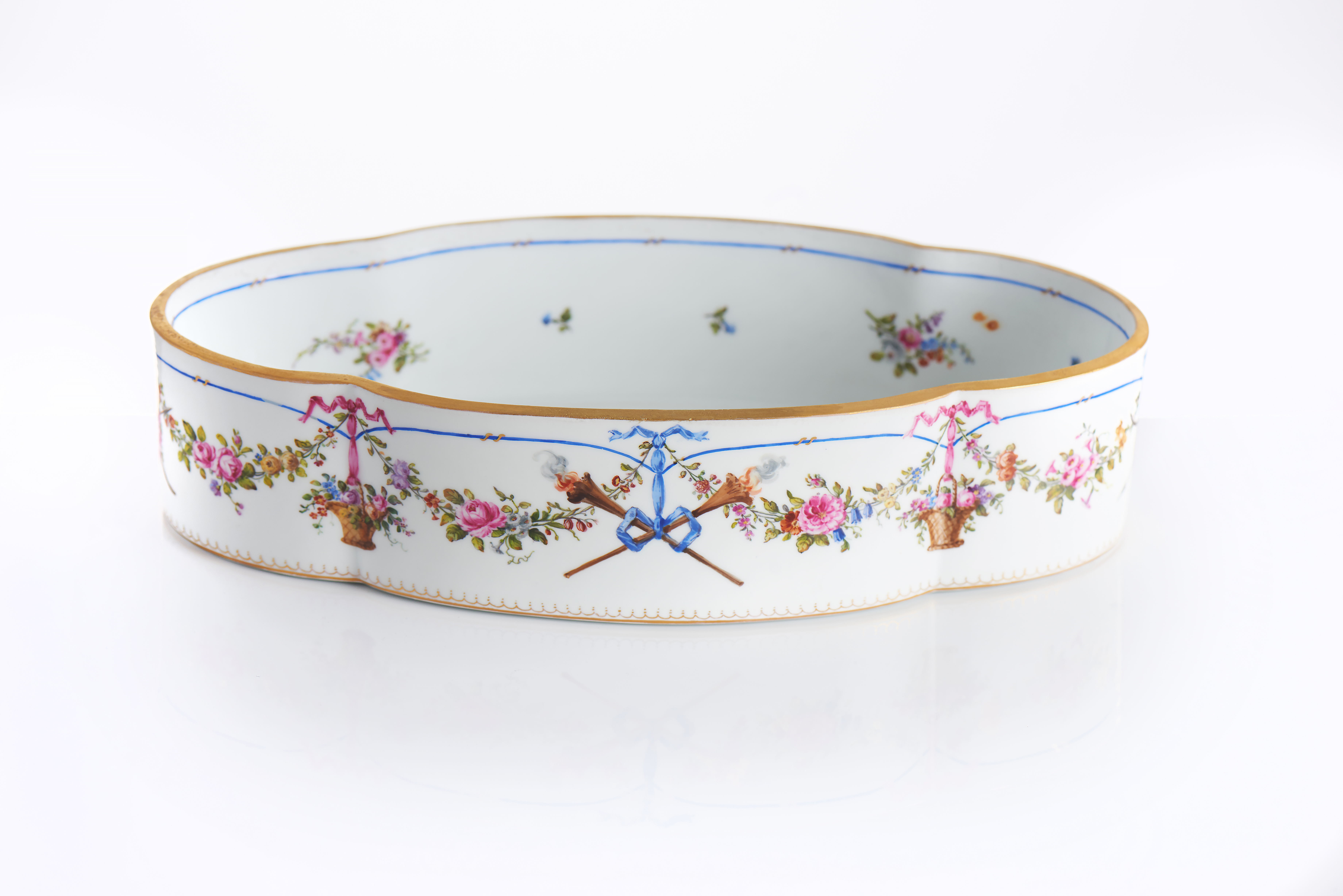 Porcelain of manual neoclassical decoration with flaming and fuming torches crossed and tied by ribbons, alternating with floral wicker baskets, flower garlands, foliage and ribbons