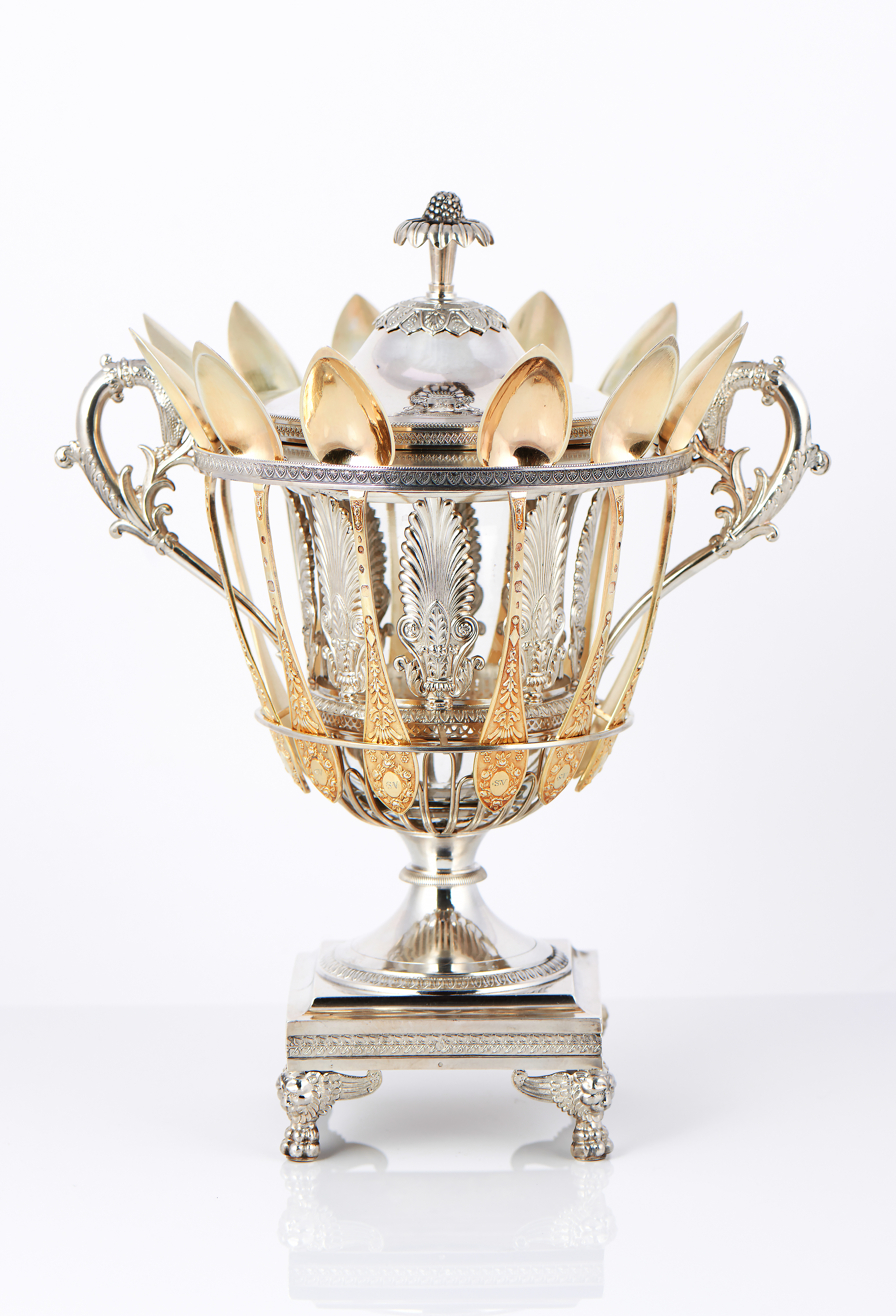 With 12 gilt spoons of foliage branches handles, lozenge, palms, oak leaf, shells, flowers and boat shaped bowl with medallion of roses garland on matte ground engraved with monogram AS