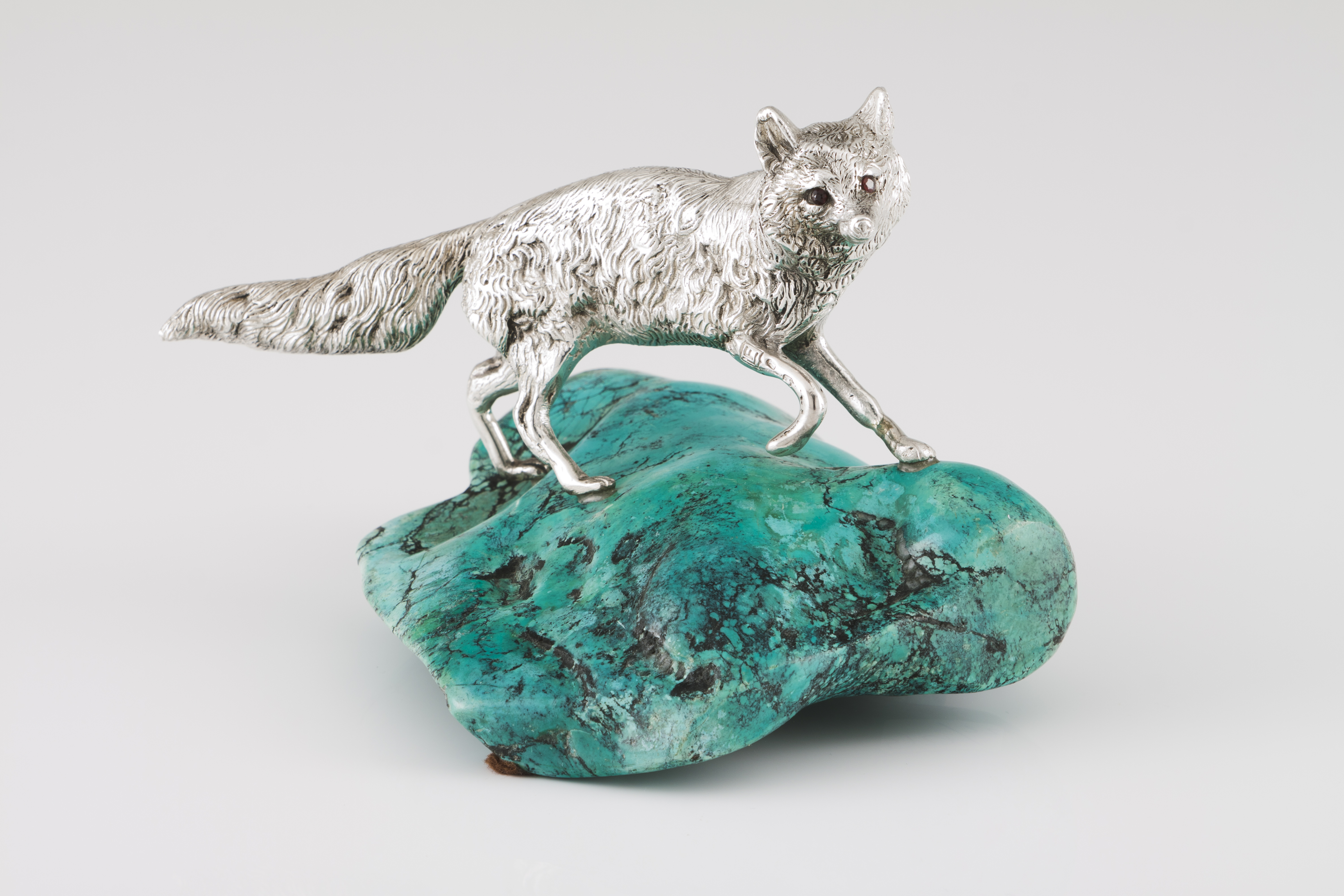 Moulded and engraved sculpture depicting a fox on a turquoise stand
