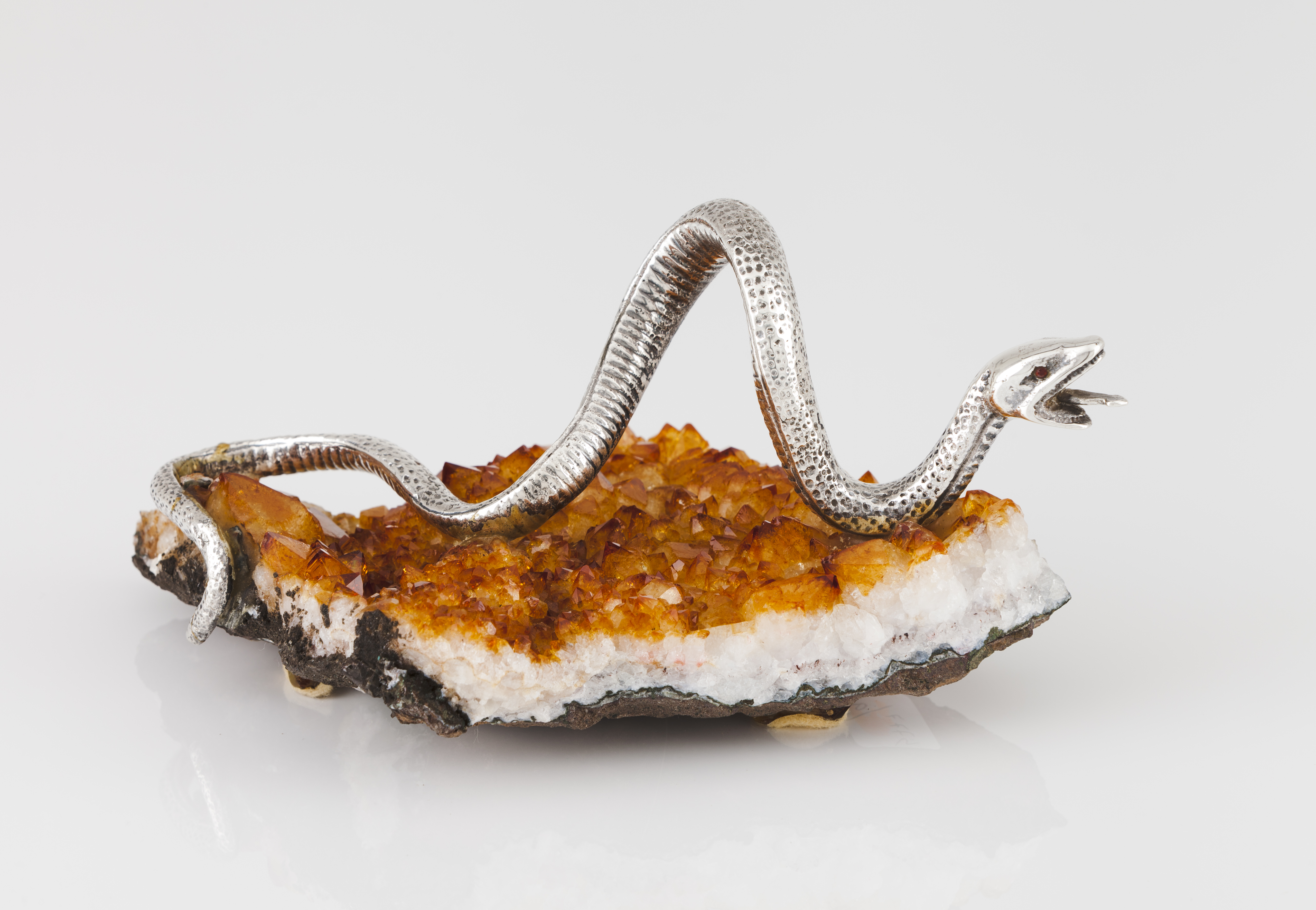 Engraved and hammered silver sculpture on a citrine quartz crystal stand