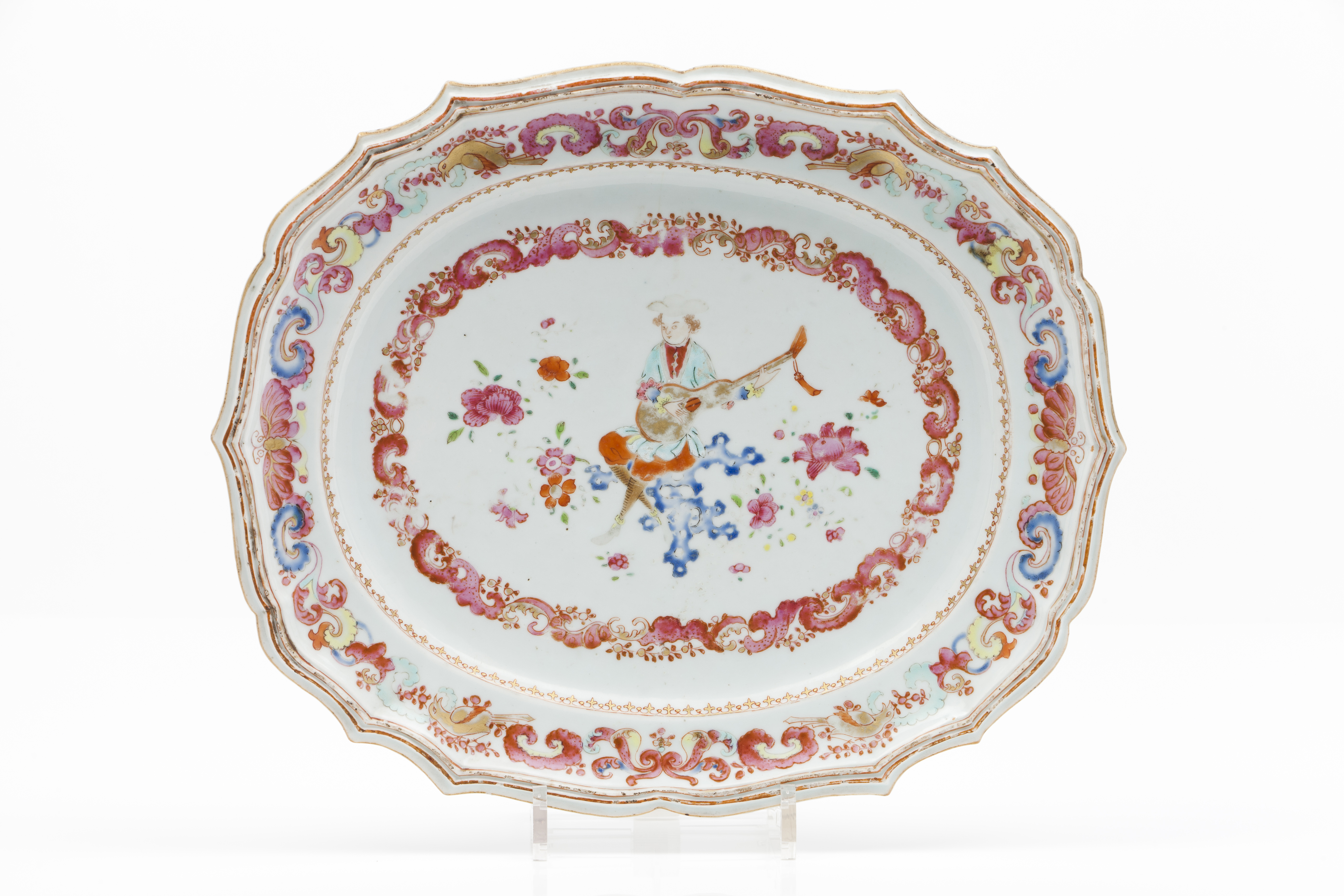 Scalloped tab and polychrome "Famille Rose" enamelled decoration with flowers and lute player
