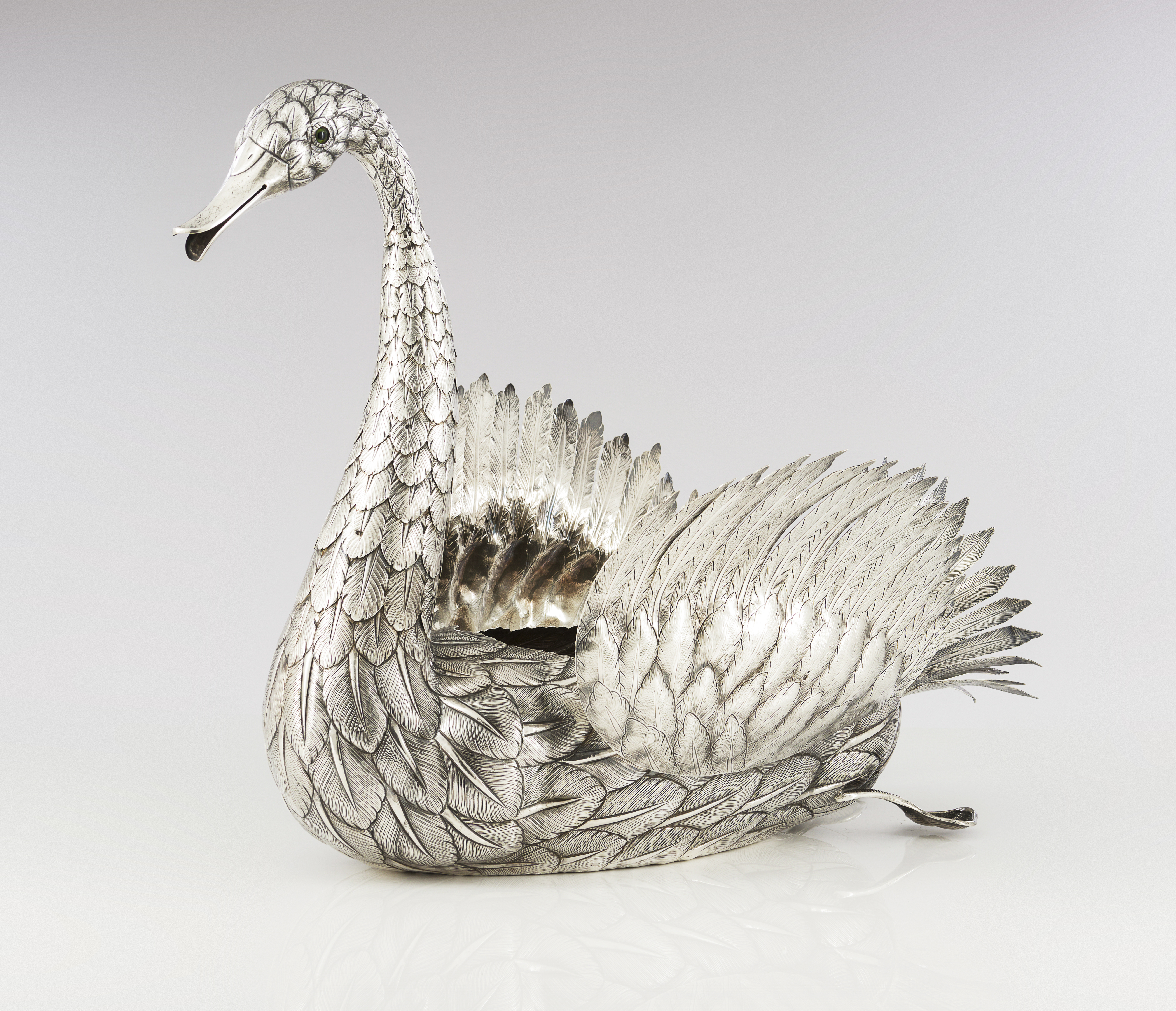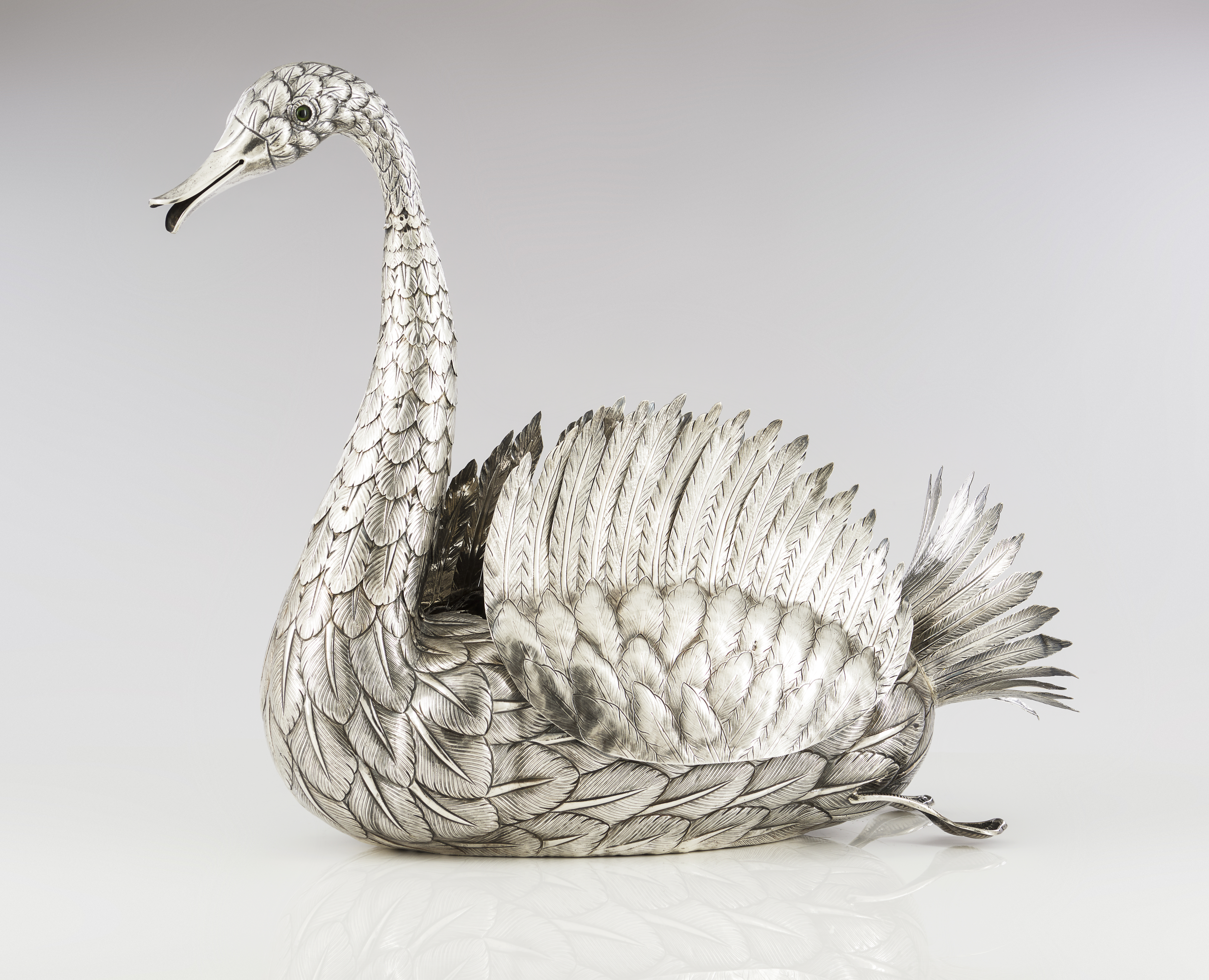 Reliefs and engraved decoration featuring swan of articulated neck and wings