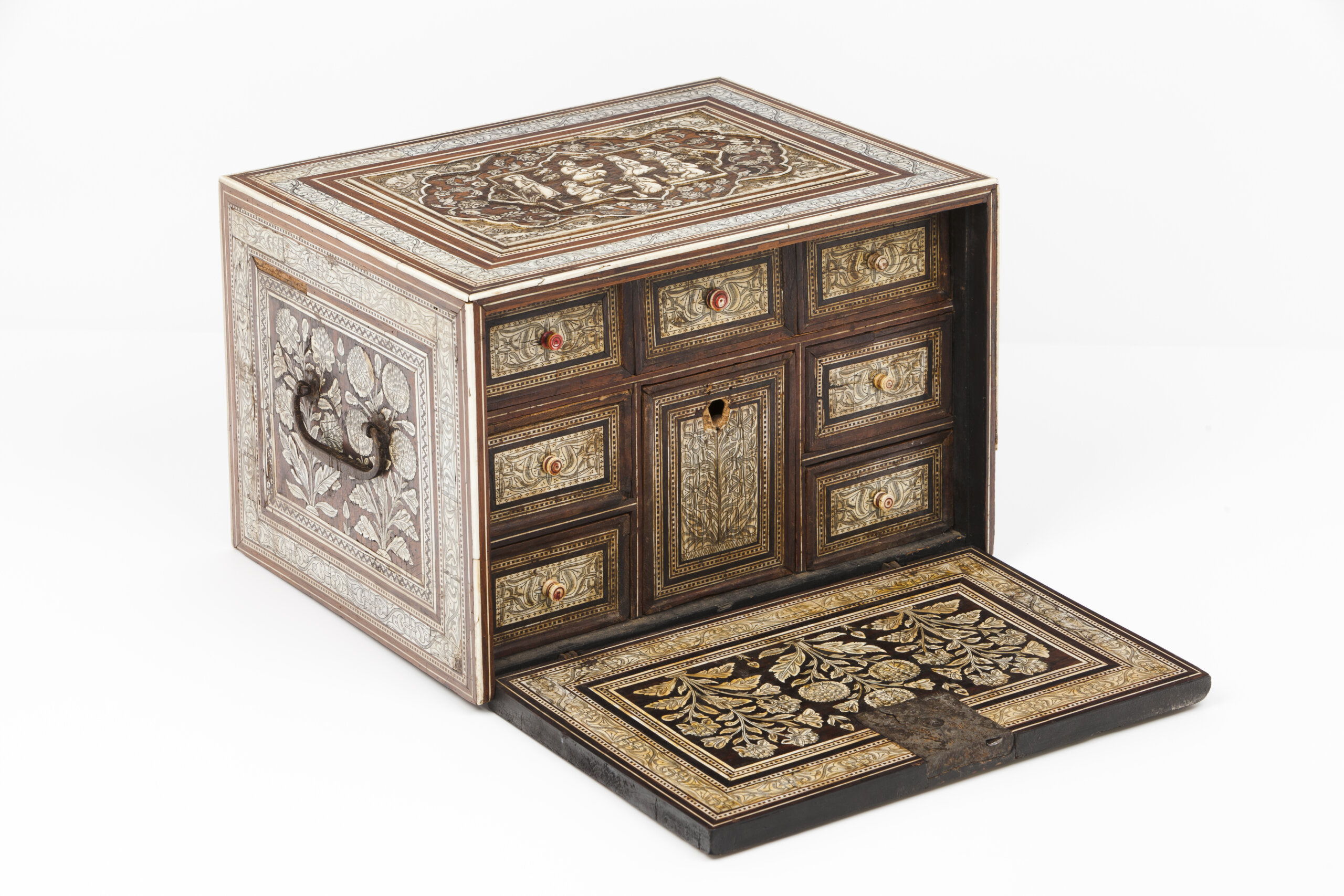 Profuse inlaid decoration in carved and engraved ivory of Mughal influence depicting floral compositions