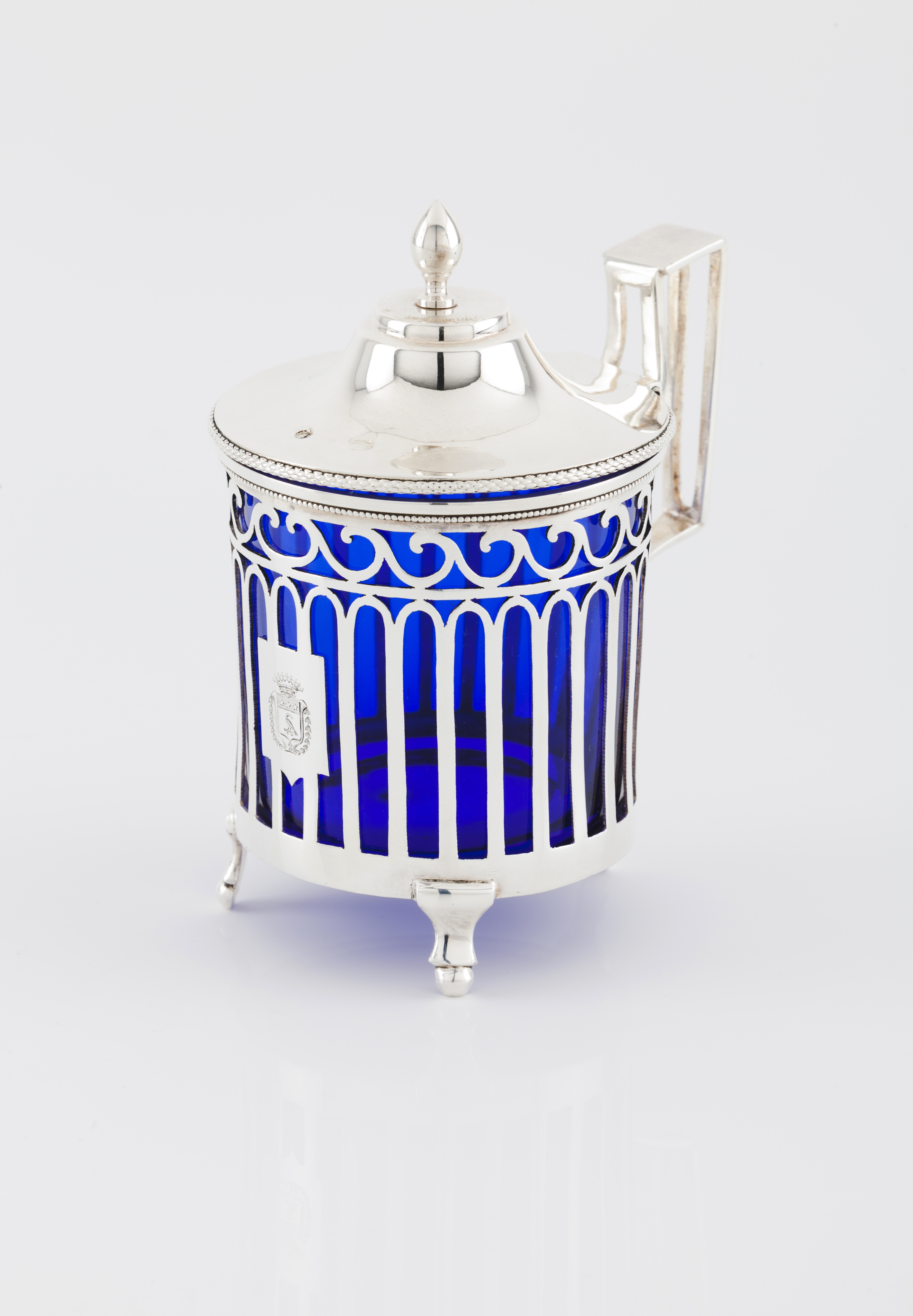 Openwork decoration with laurel garlands and scroll cartouche with engraved heraldic shield topped by count's coronet. On three feet