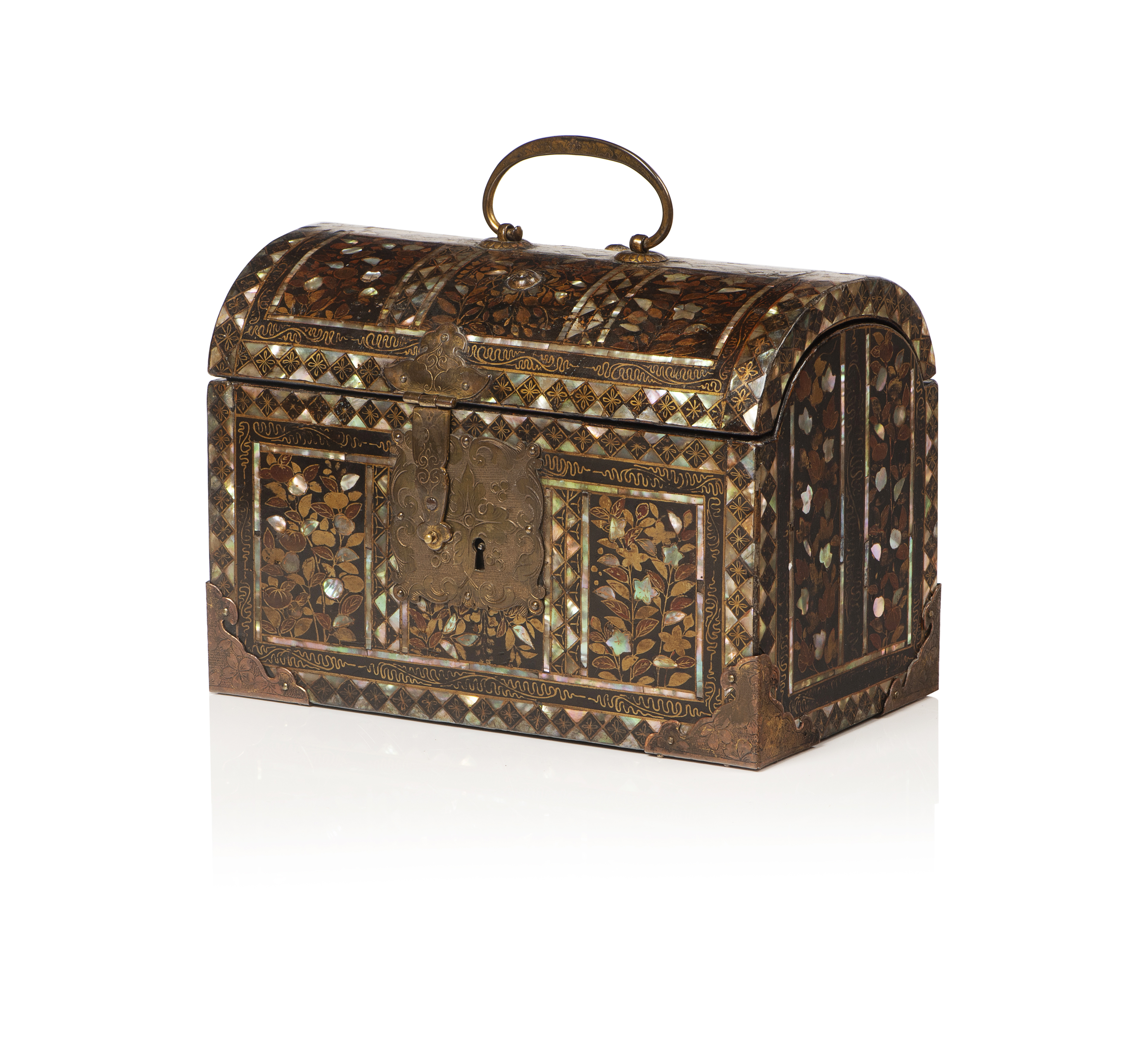Namban "karakusa" panelled decoration framed by mother-of-pearl inlaid bands in geometric pattern