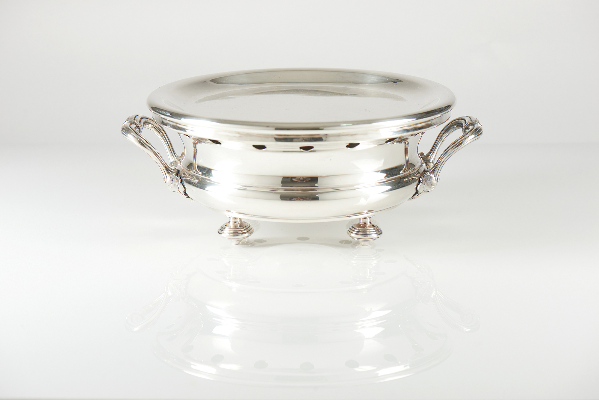Maker CHRISTOFLE à Paris, in plain silvered metal of circular shape, resting on 4 filleted spinning top feet, the handles framed by filleting and foliage. With its removable base