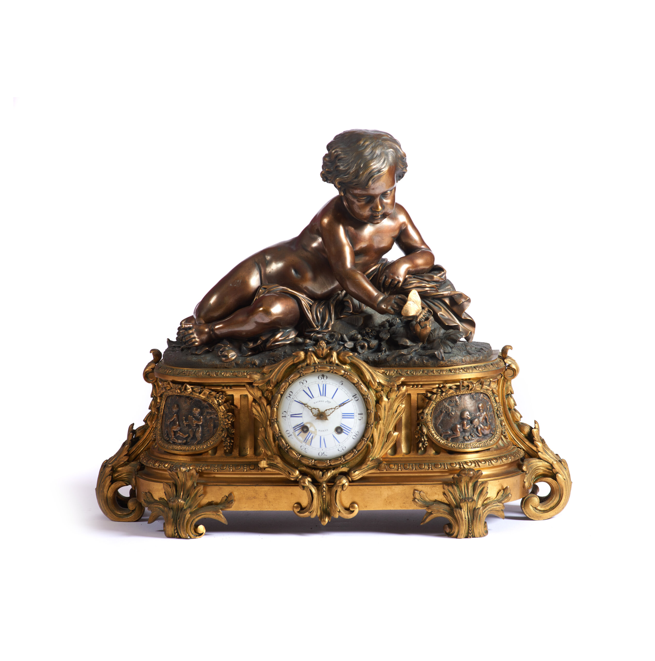 Enamelled dial of Roman numbering for the hours and Arabic numbers for the minutes, signed "Raingo Frères"