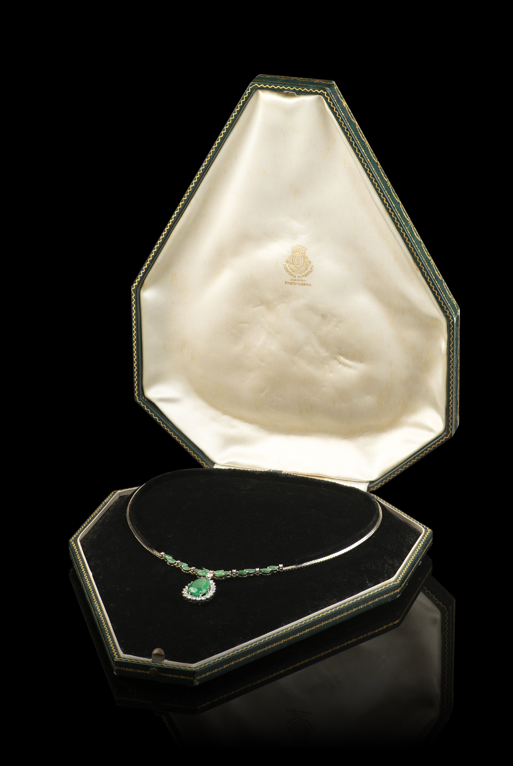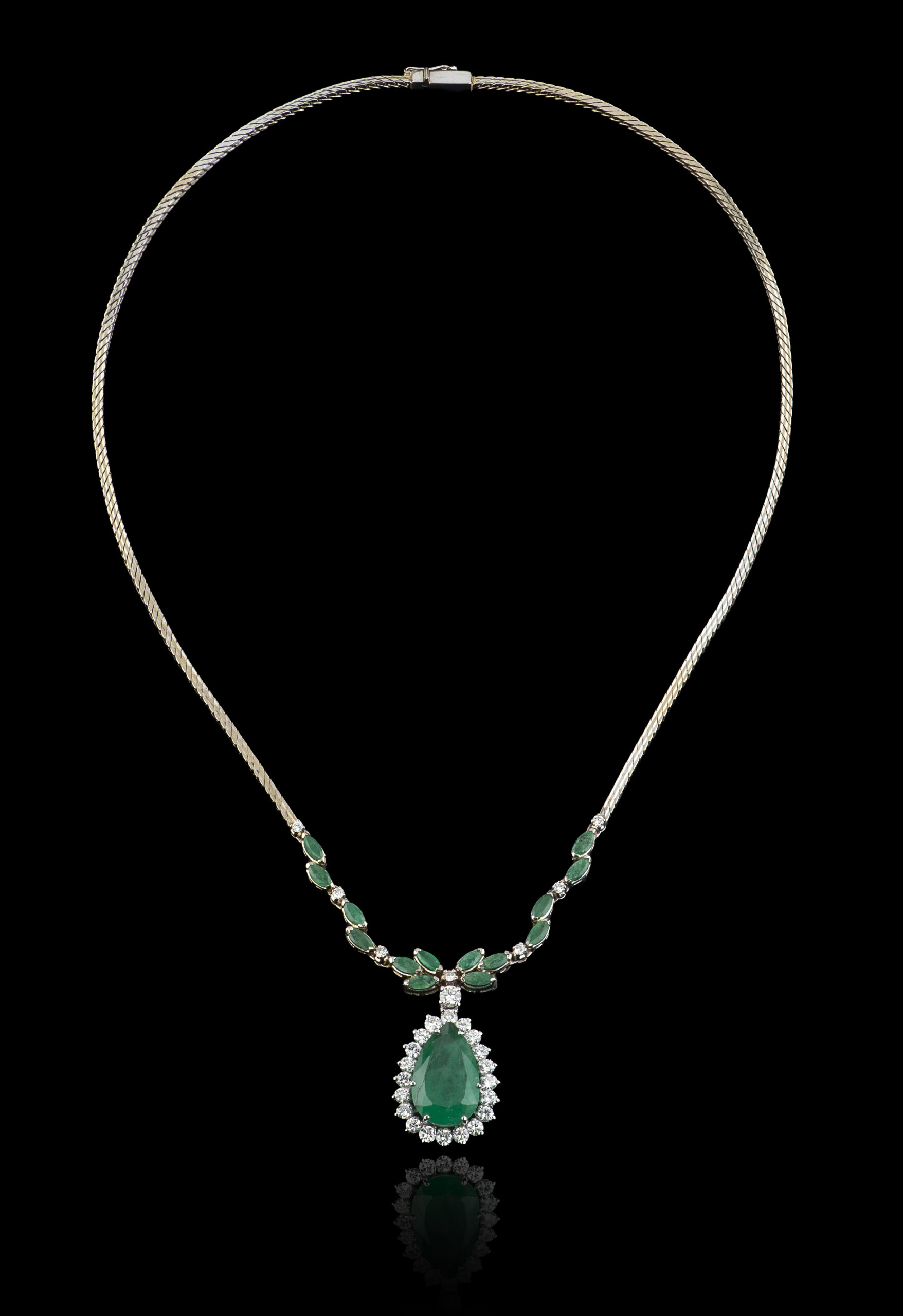 Set with 14 navette-cut emeralds, 1 pear-cut emerald and 28 brilliant-cut diamonds with an approximate total weight of 1.56 ct