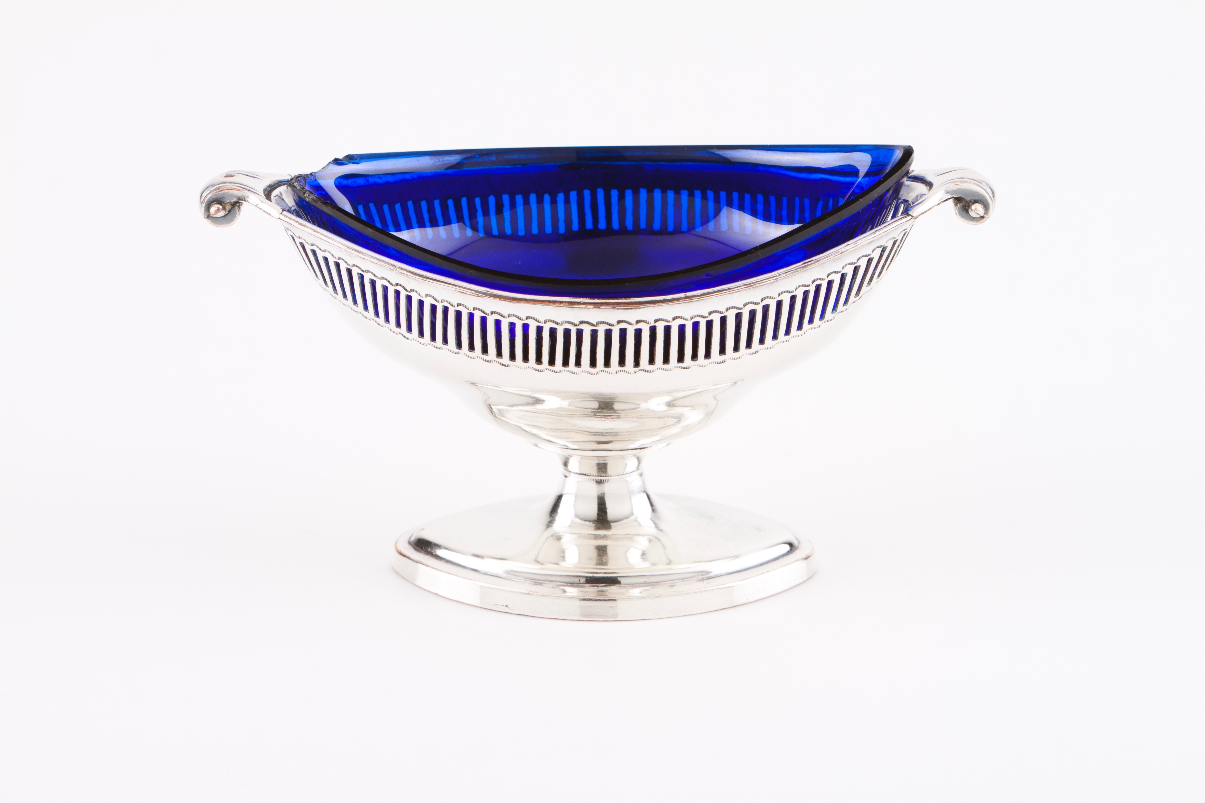 Silverplated with pieced decoration, cobalt blue crystal liner
