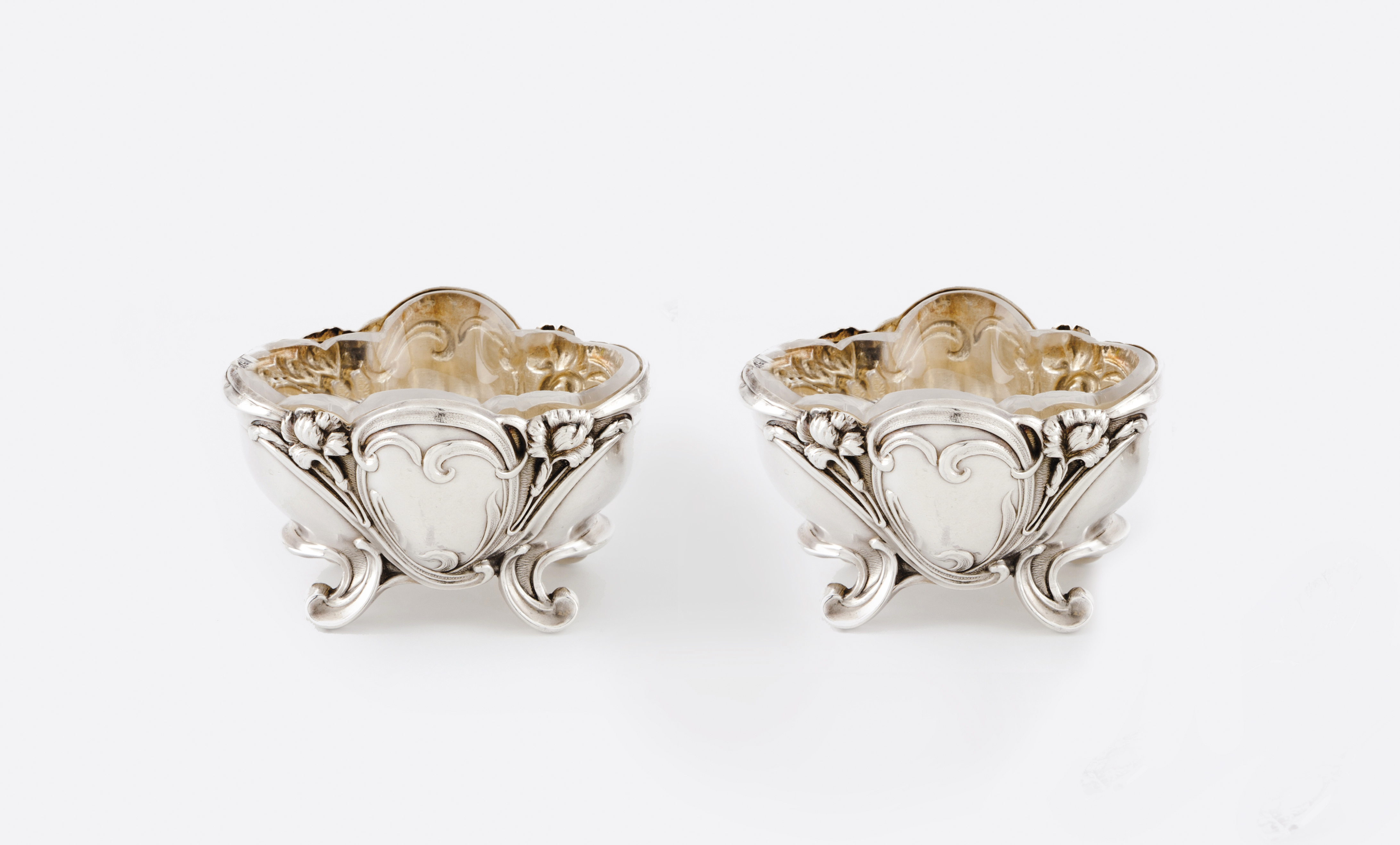French silver of floral and foliage decoration on 4 stylised foliage feet, gilt interiors and glass liners