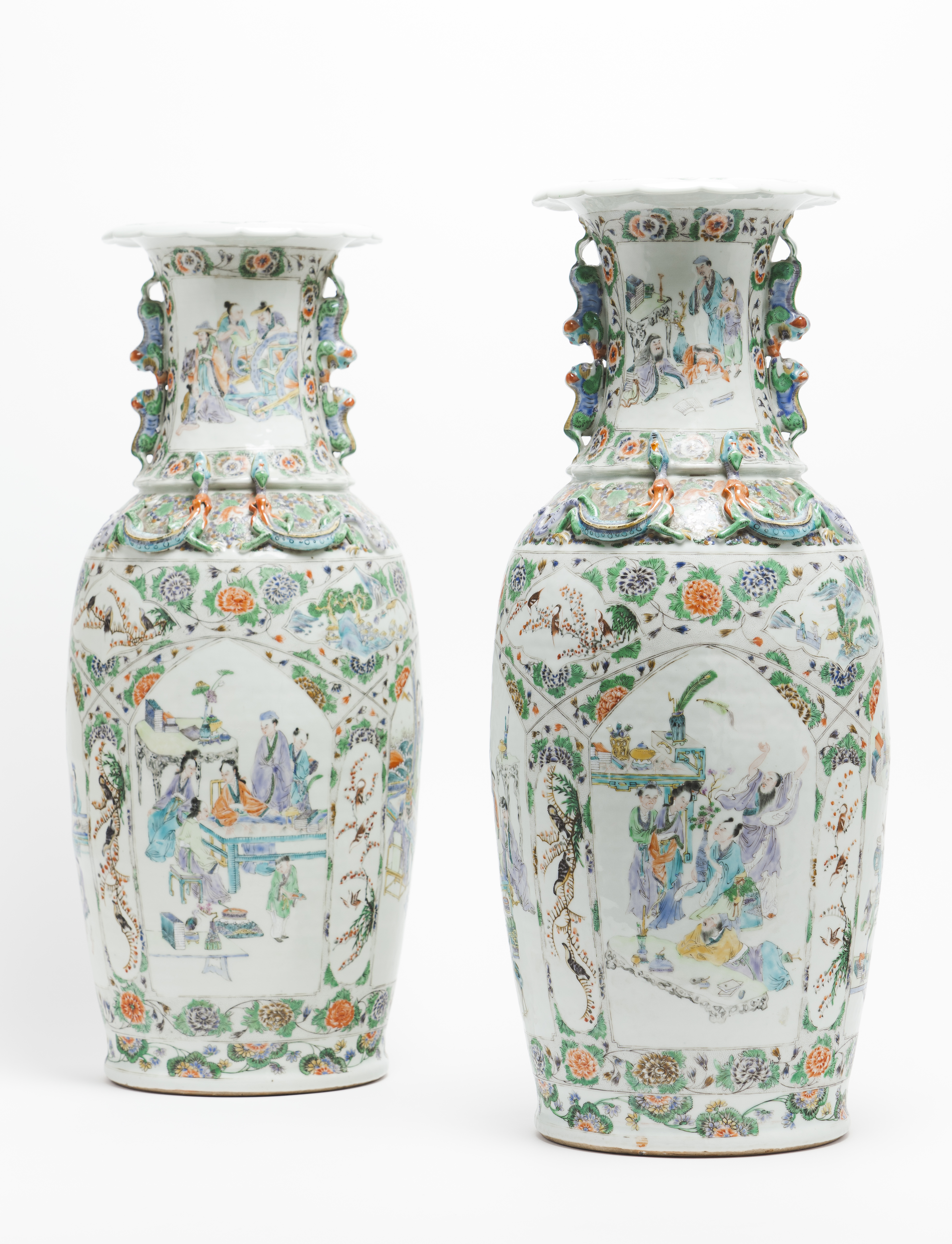 Both decorated with cartouches reserved over flower pattern, containing scenes with scholars, court ladies and children, between smaller cartouches with landscapes and compositions with flowers and birds