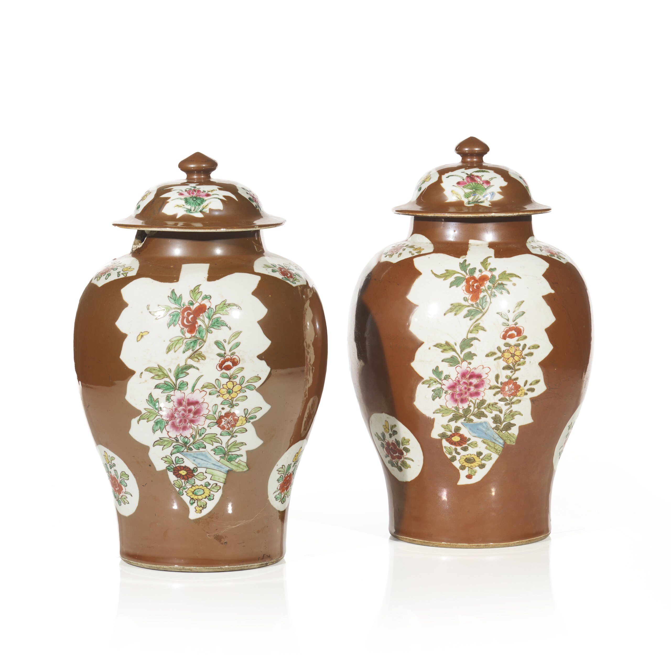 A pair of Chinese export porcelain chocolate ground covered jars