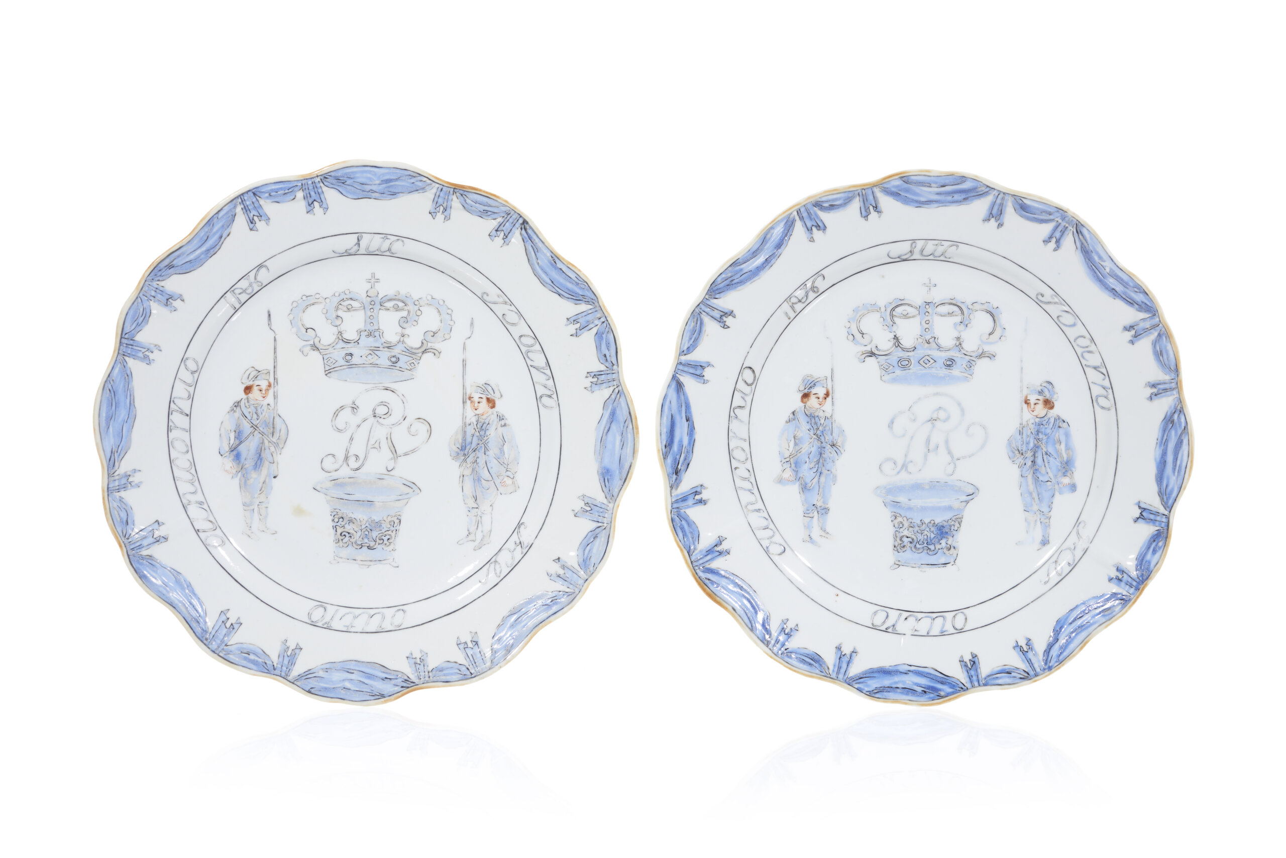 A pair of Chinese export porcelain plates decorated at the Royal College of Nobles of Lisbon