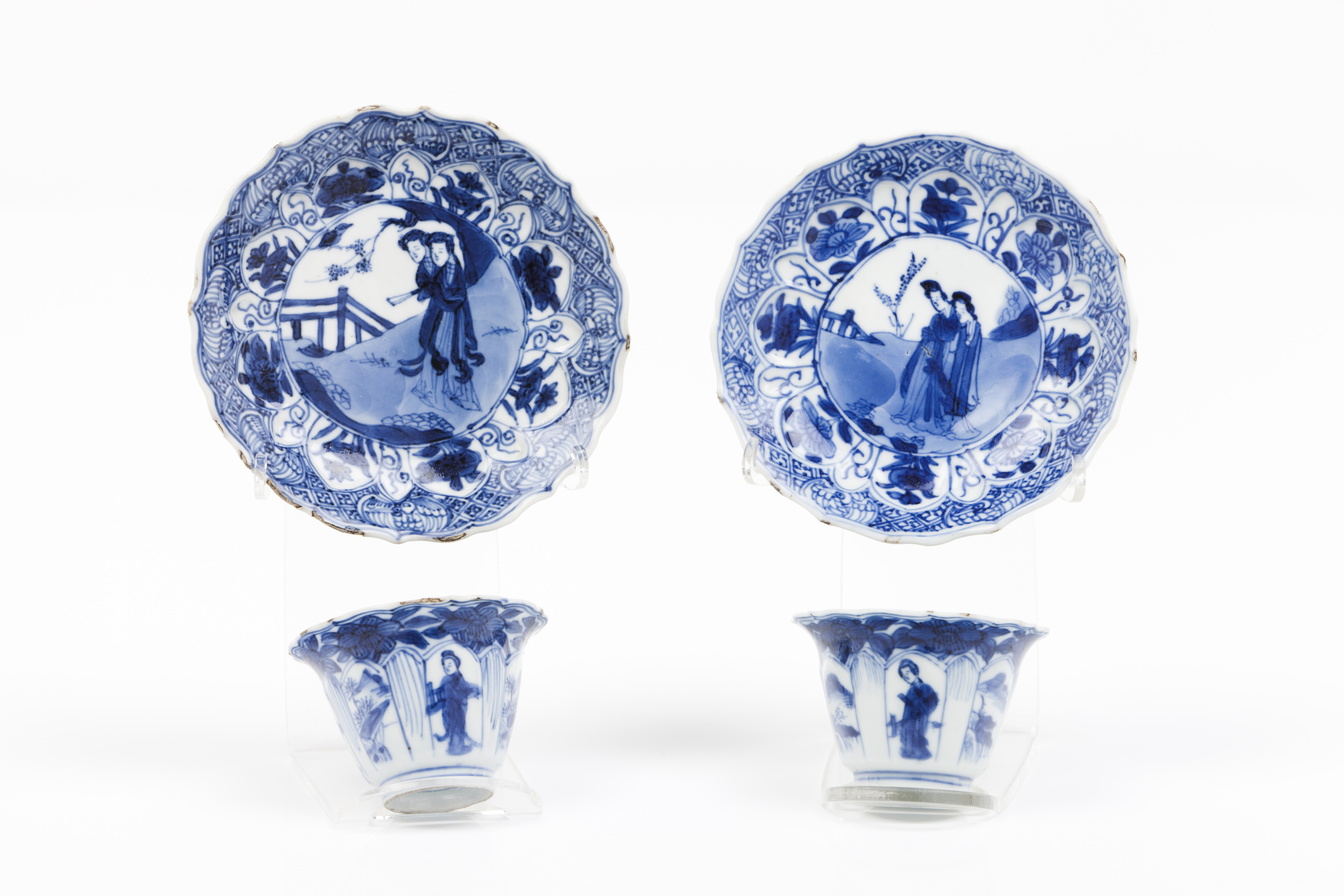 Blue and white decoration of garden views with female figures, landscapes and floral motifs