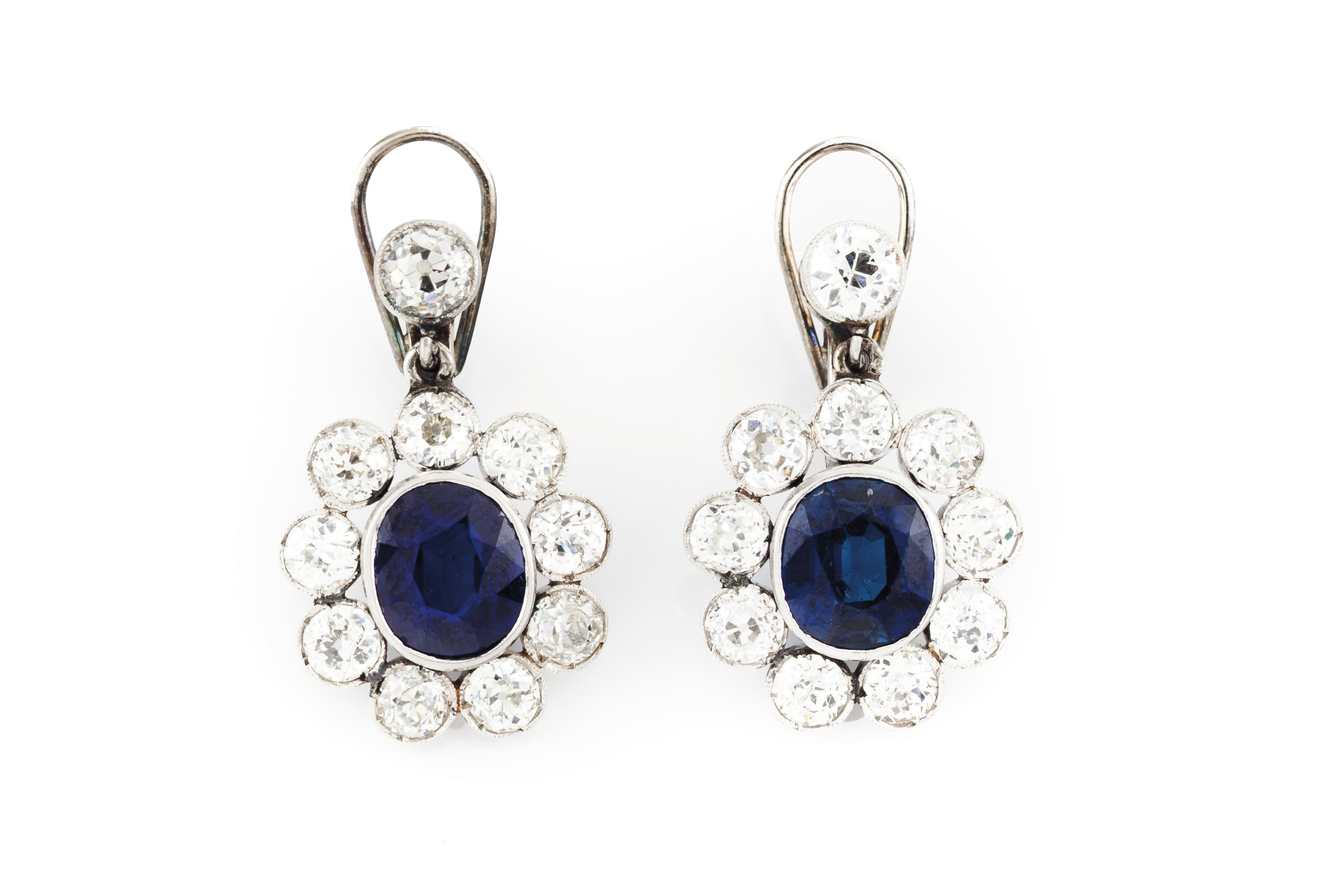 Set with two Ceylon sapphires totalling (ca. 4.90ct) framed by antique brilliant cut diamonds frieze (29) of colour white totalling (ca. 6.80ct)