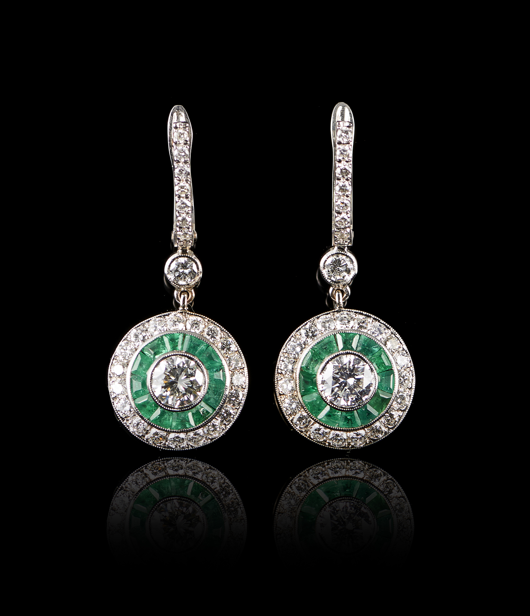Set with calibrated emeralds, 54 brilliant cut diamonds weighing approximately 1.50 ct. and 2 brilliant cut central diamonds weighing approximately 1.50 ct.