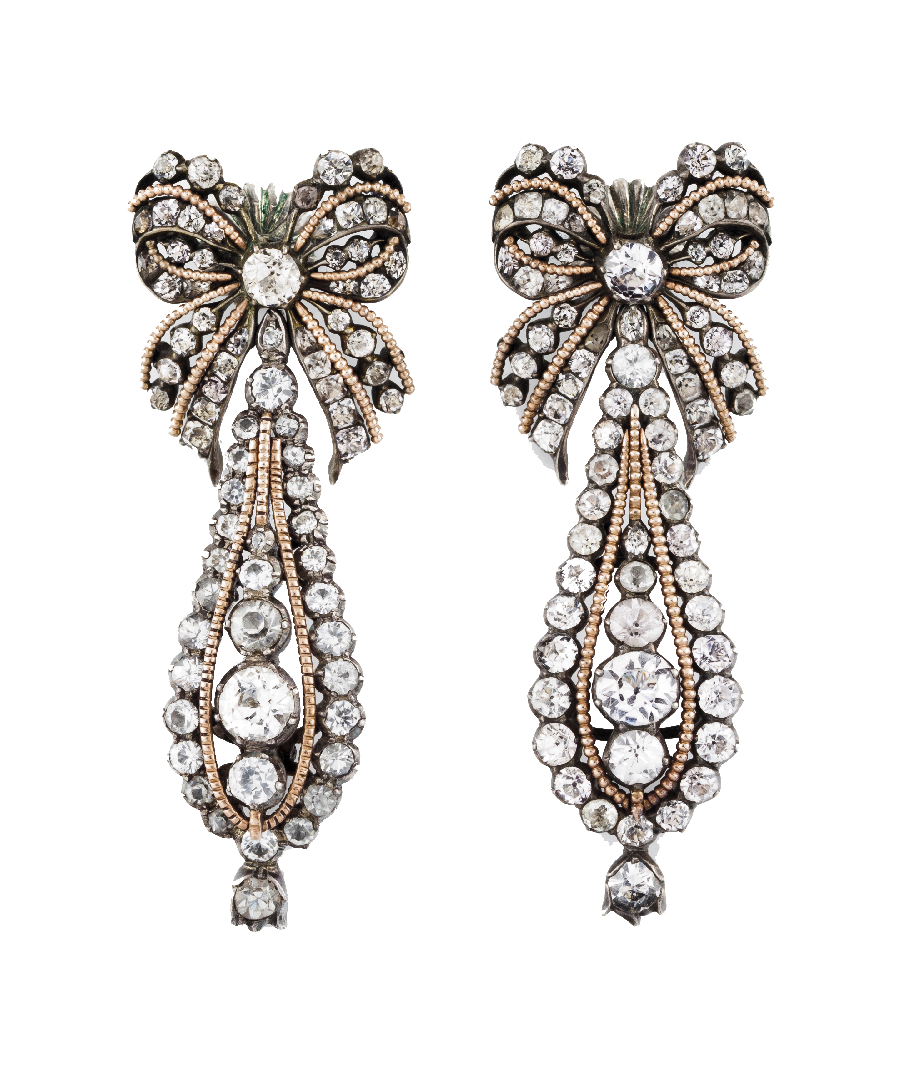 Bow with ribbons and tear shaped drop highlighted in twisted gold threads set with chrysoberyl's