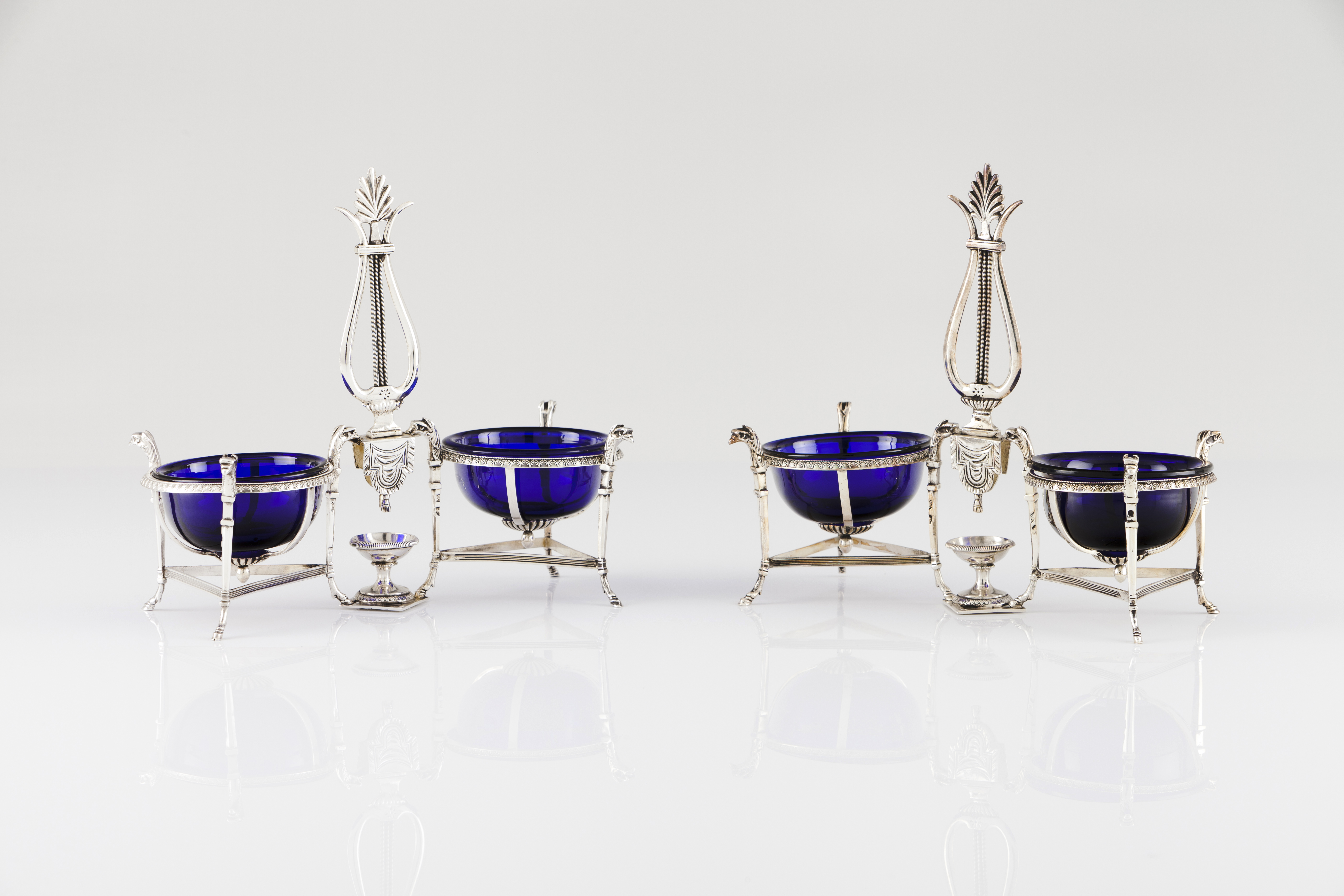 Six hind feet and eagle-head uprights and lyre shaped grip decoration. Blue crystal liners