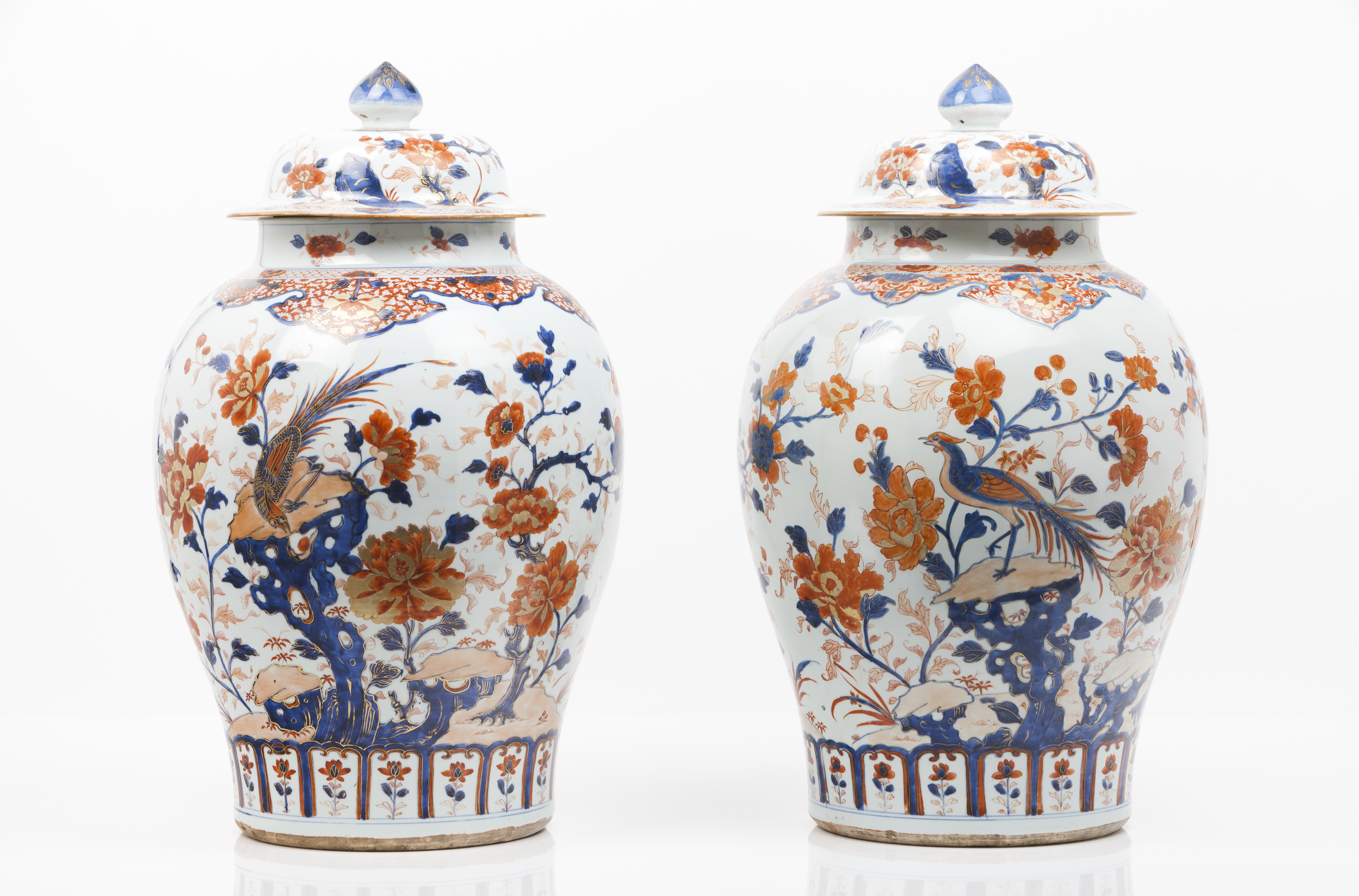Blue underglaze, iron-oxide and gilt decoration of garden view with pheasants, rocks and peonies