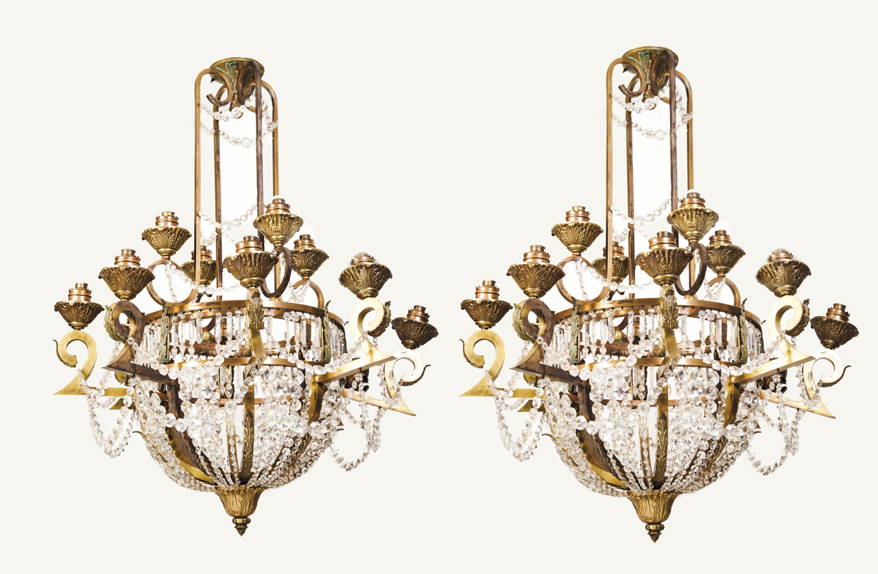 A pair of large eight-light gilt-bronze and cut-glass chandelier