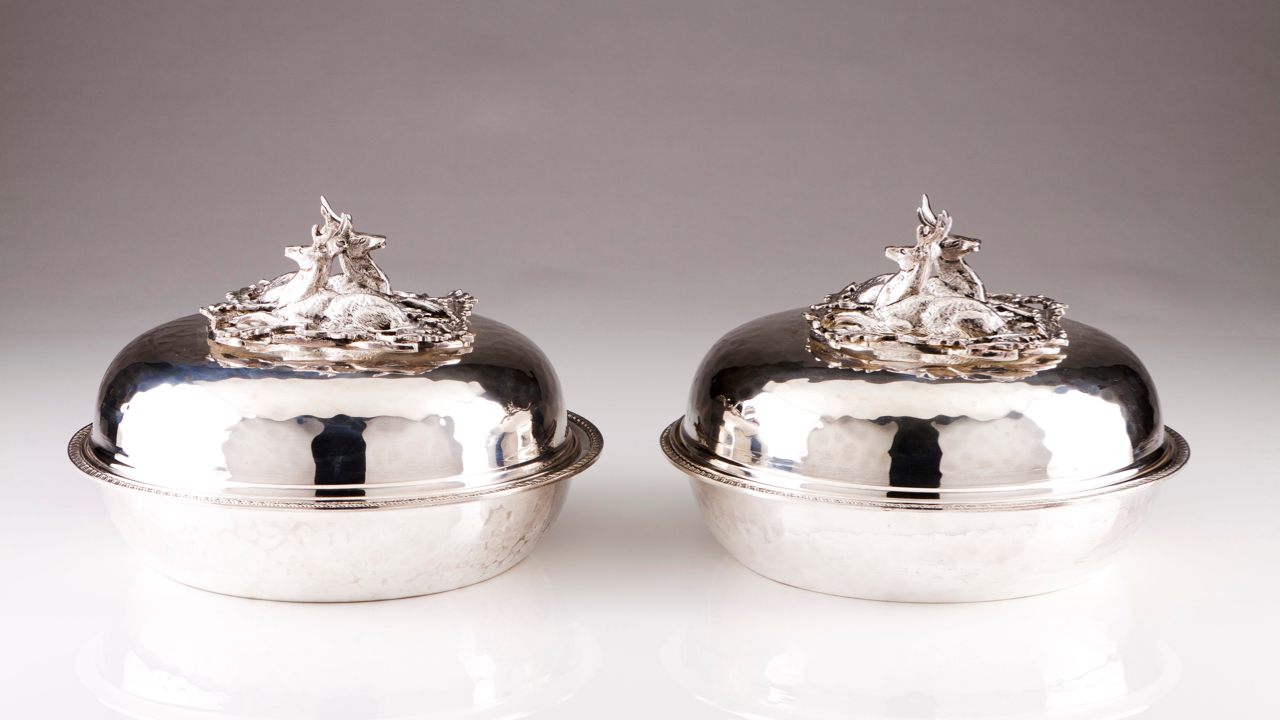 Hammered decoration, cover finials with deers, leaves and trunks
