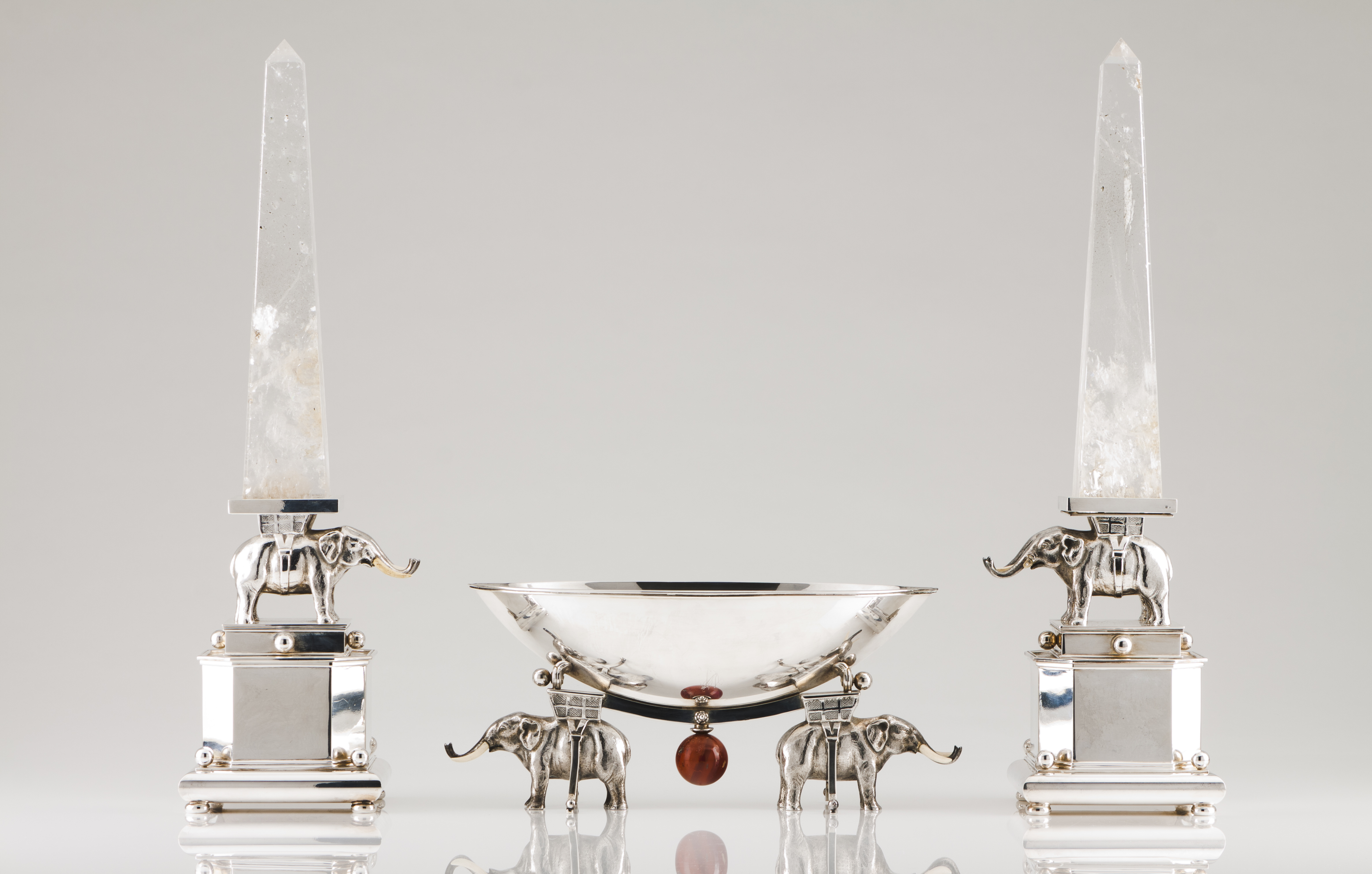 Sculpted elephants of ivory tusks supporting rock crystal (hyaline quartz)