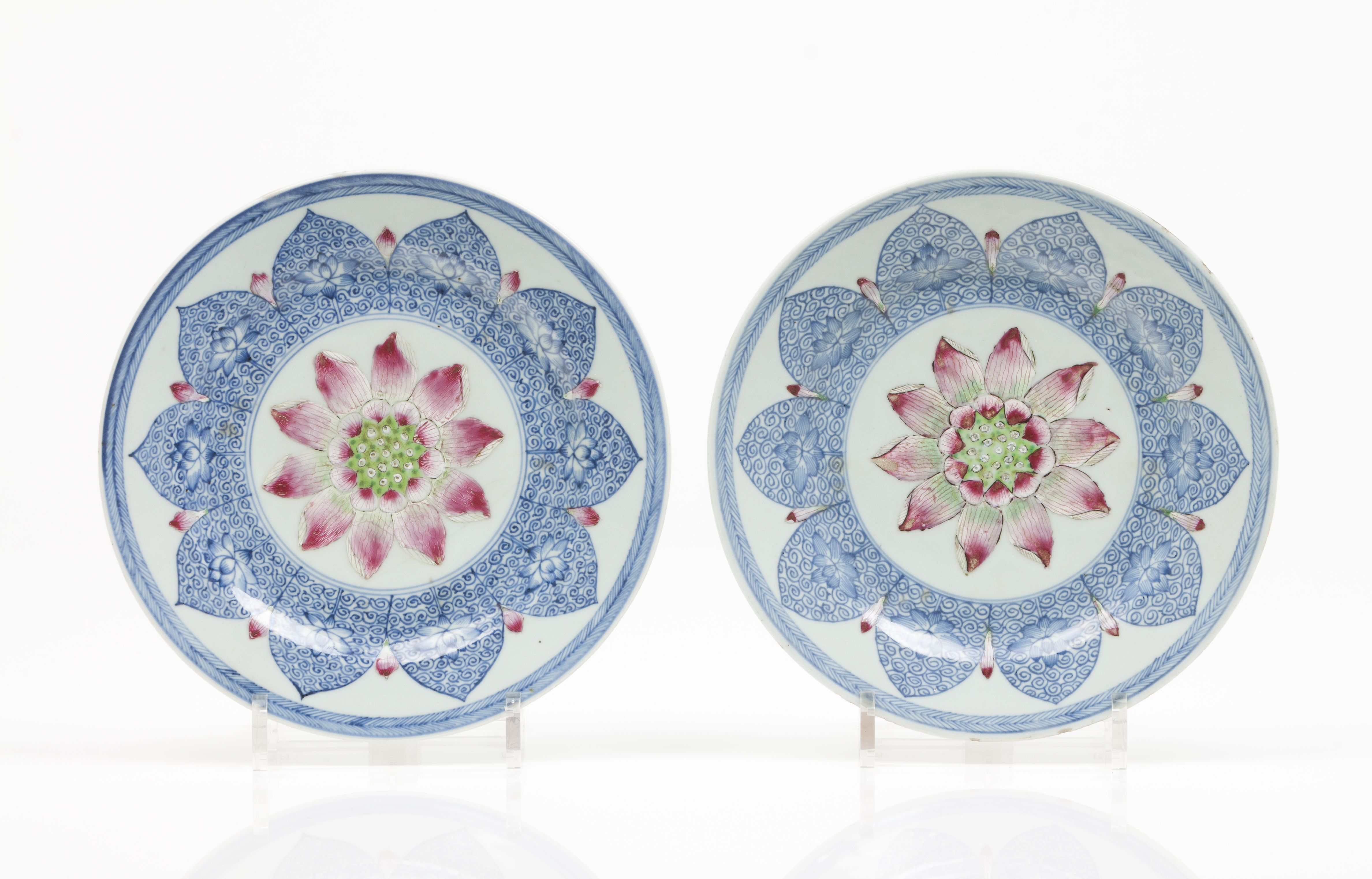 "Famille Rose" enamelled and blue underglaze decoration with lotus flowers
