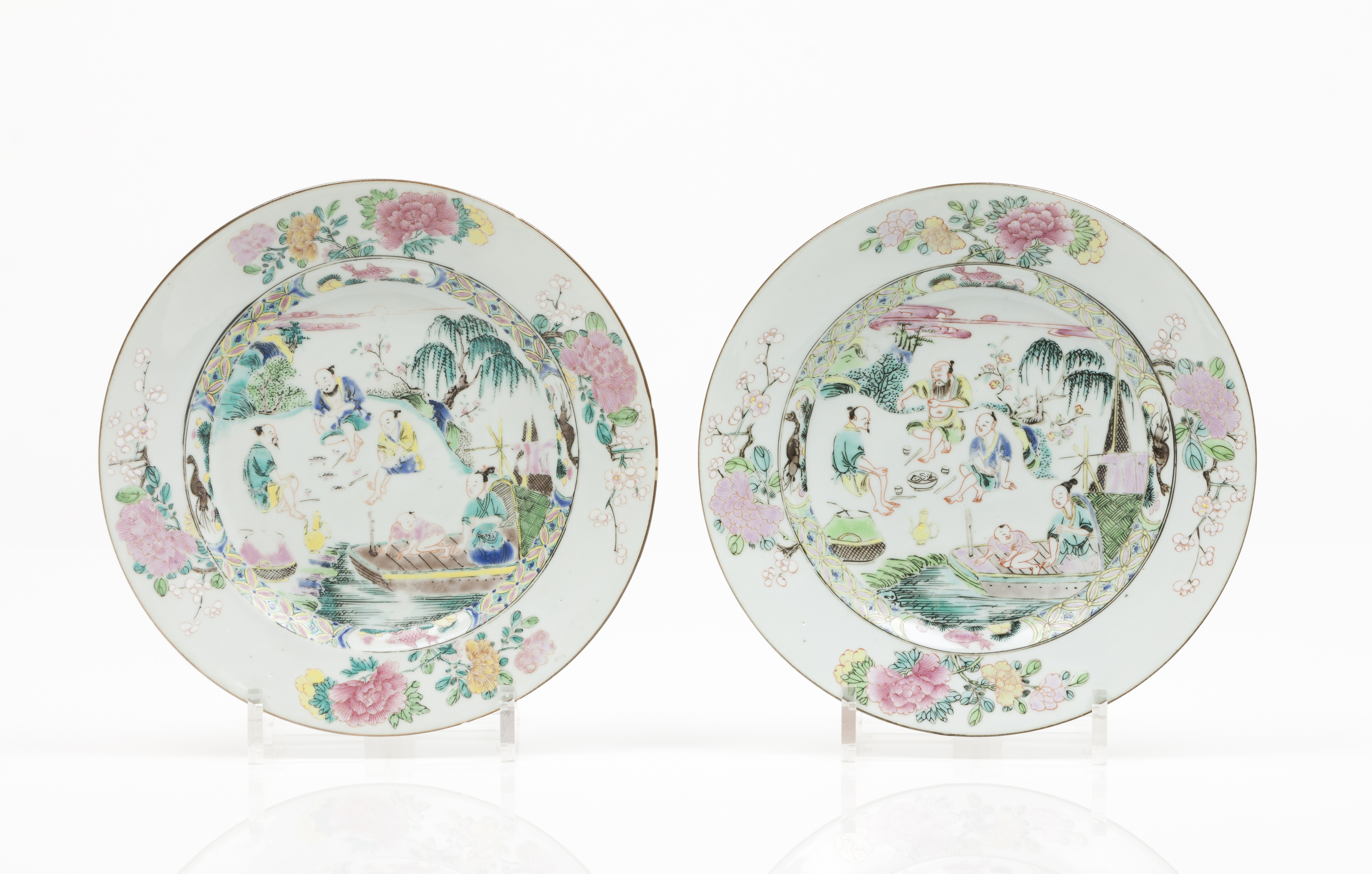 Polychrome "Famille Rose" enamelled decoration with river view with fishermen