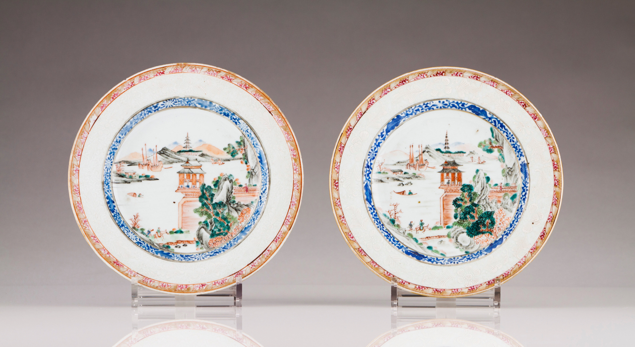 Damask "bianco sopra bianco" and polychrome decoration depicting Chinese pier with caravels