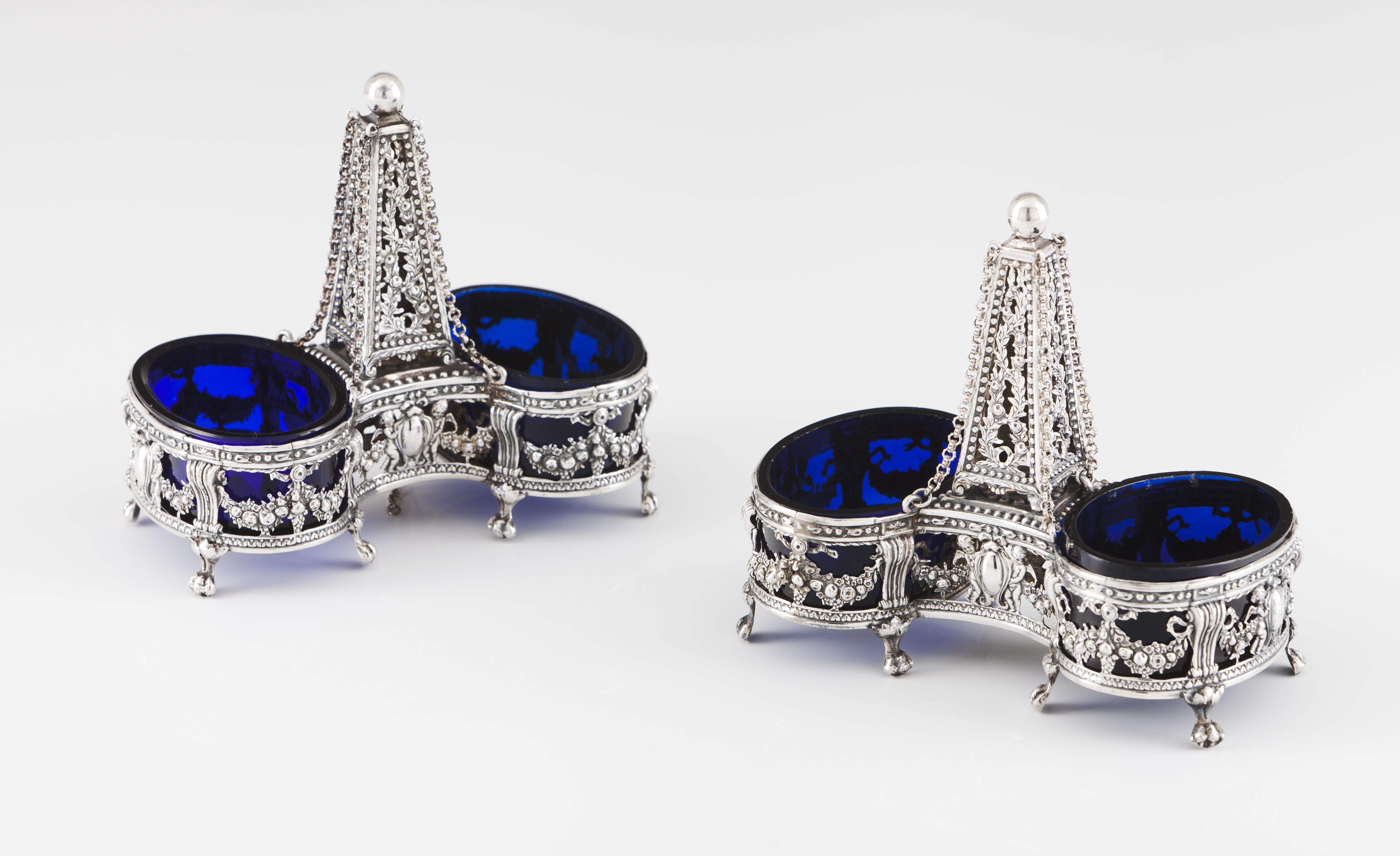 French silver of flower and fruit garlands, medallions, ribbons and architectural elements openwork decoration centred by a blank cartouche supported by cherubs. Central obelisk shaped pommel, surmounted by sphere with ornamentation with flower garlands foliage, ribbons and beading, marked "Charge", "Décharge", "Jurande, 1783". Blue glass liners