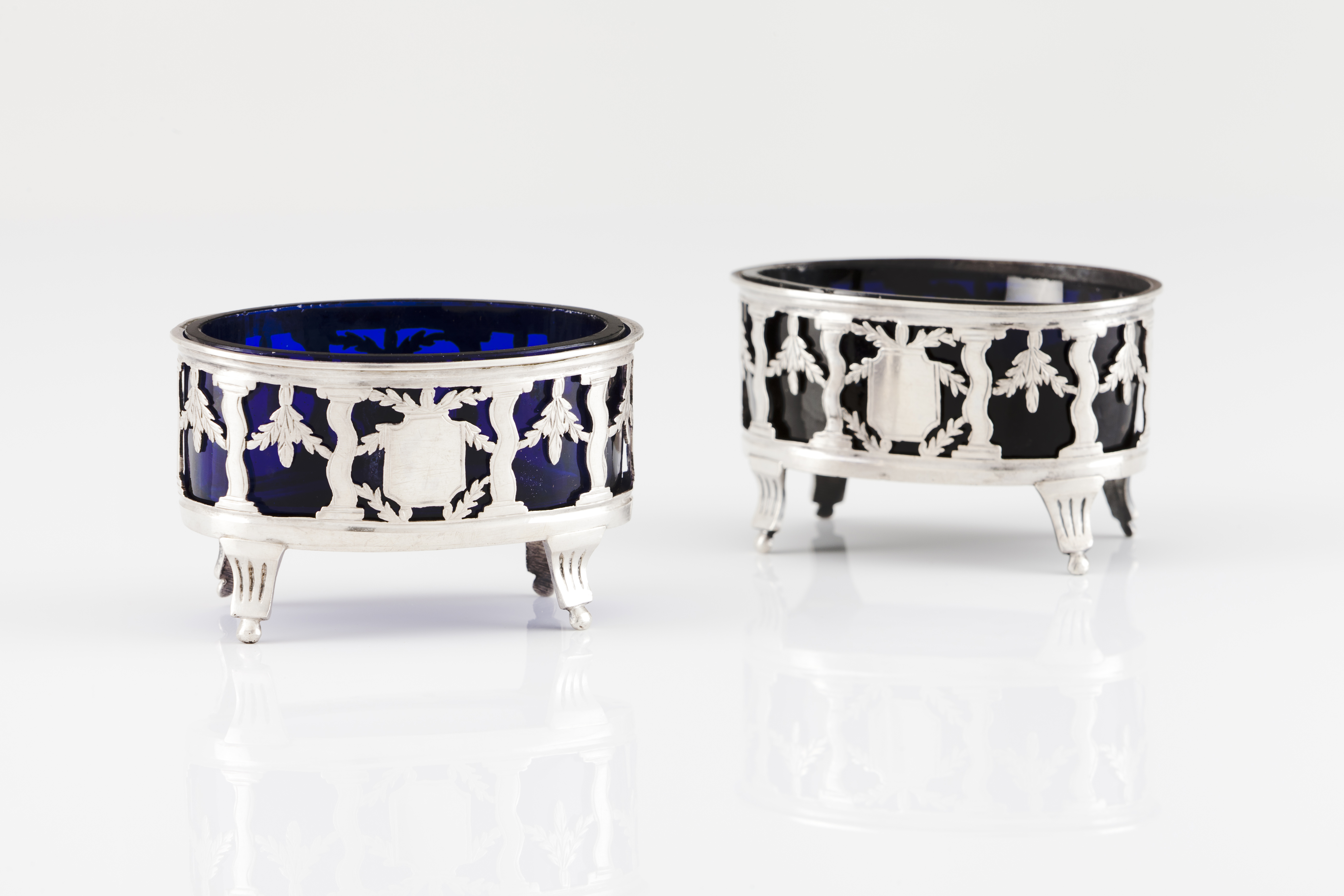 Boat shaped of pierced decoration with twisted columns, engraved laurel garlands and two blank cartouches, resting on 4 ball finial feet. Blue glass liners