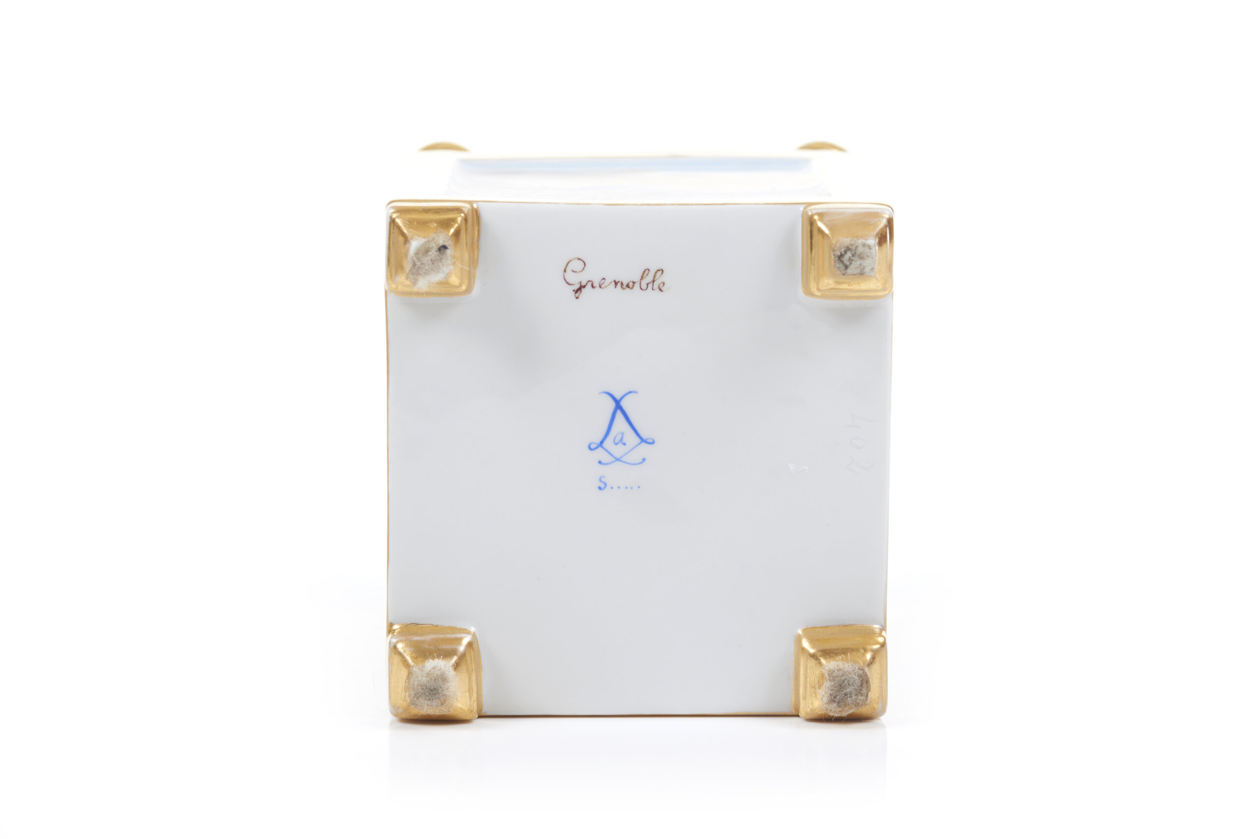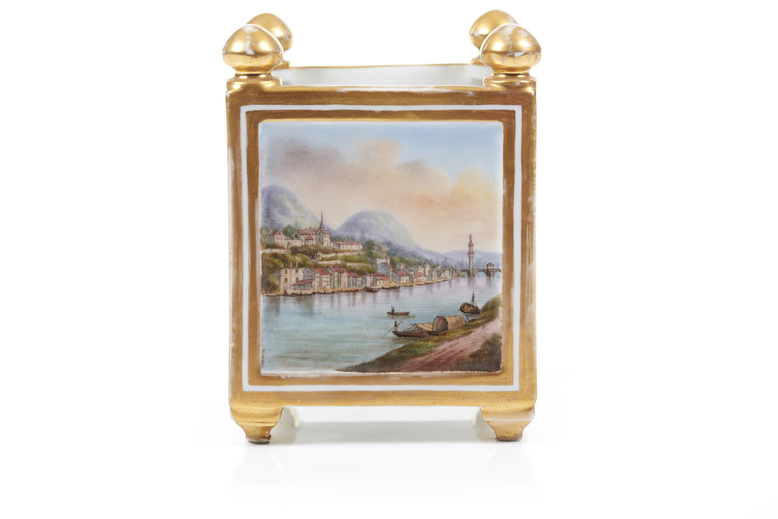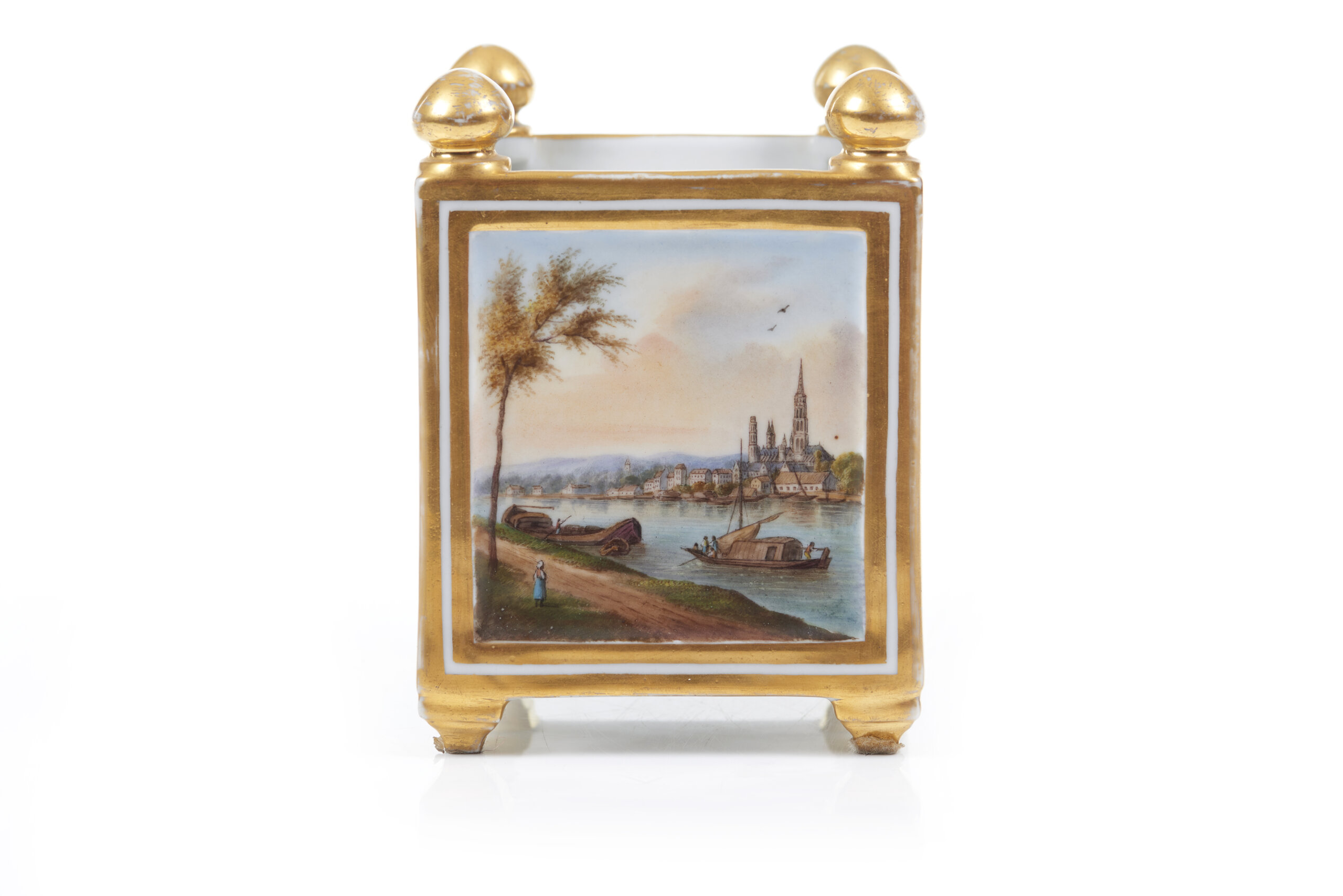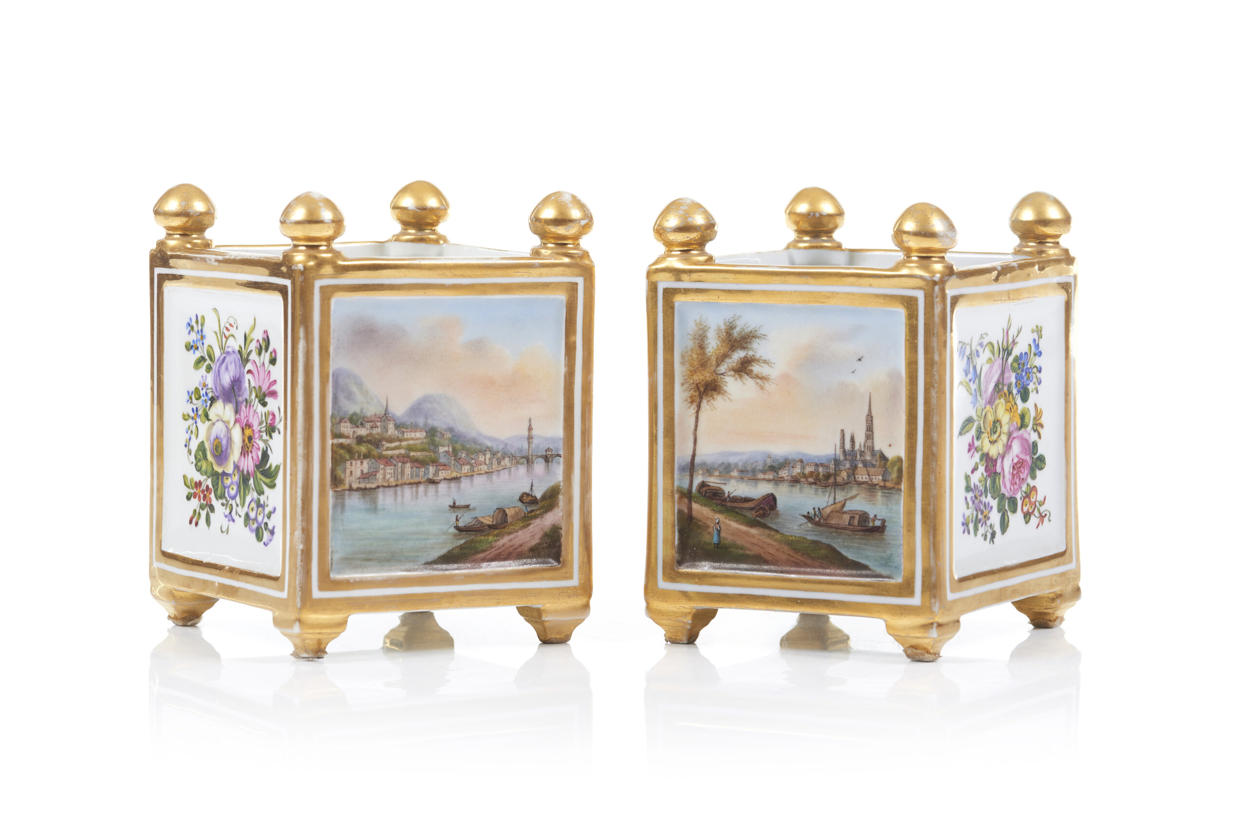 Of square shape, each painted on one side with a titled topographical view - “Grenoble” and “Rouen” inscribed to the base in iron-red - the remaining sides with polychrome floral bouquets within gilt frames