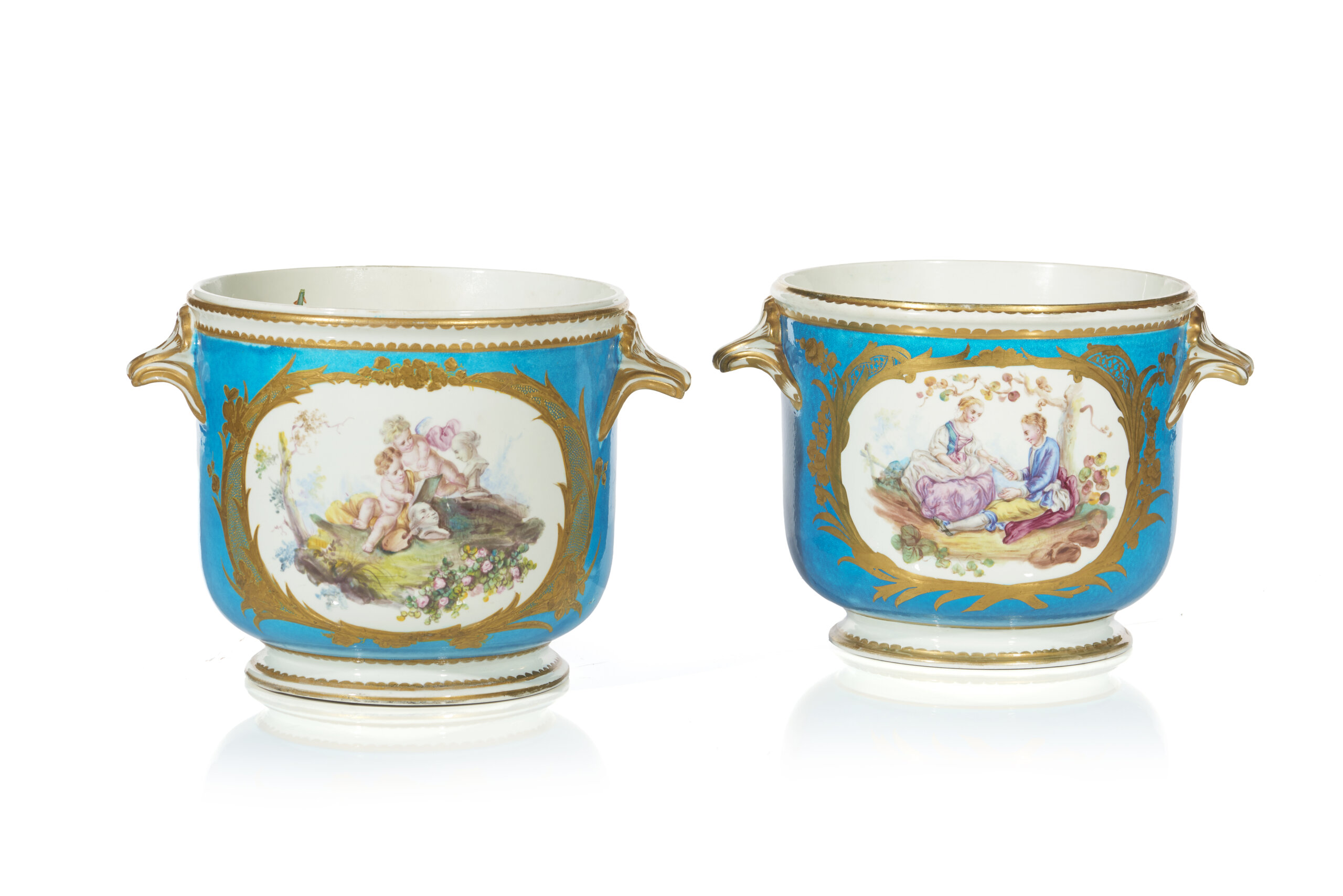 Celeste blue decoration with polychrome reserves depicting flowers and landscapes with gallant scenes