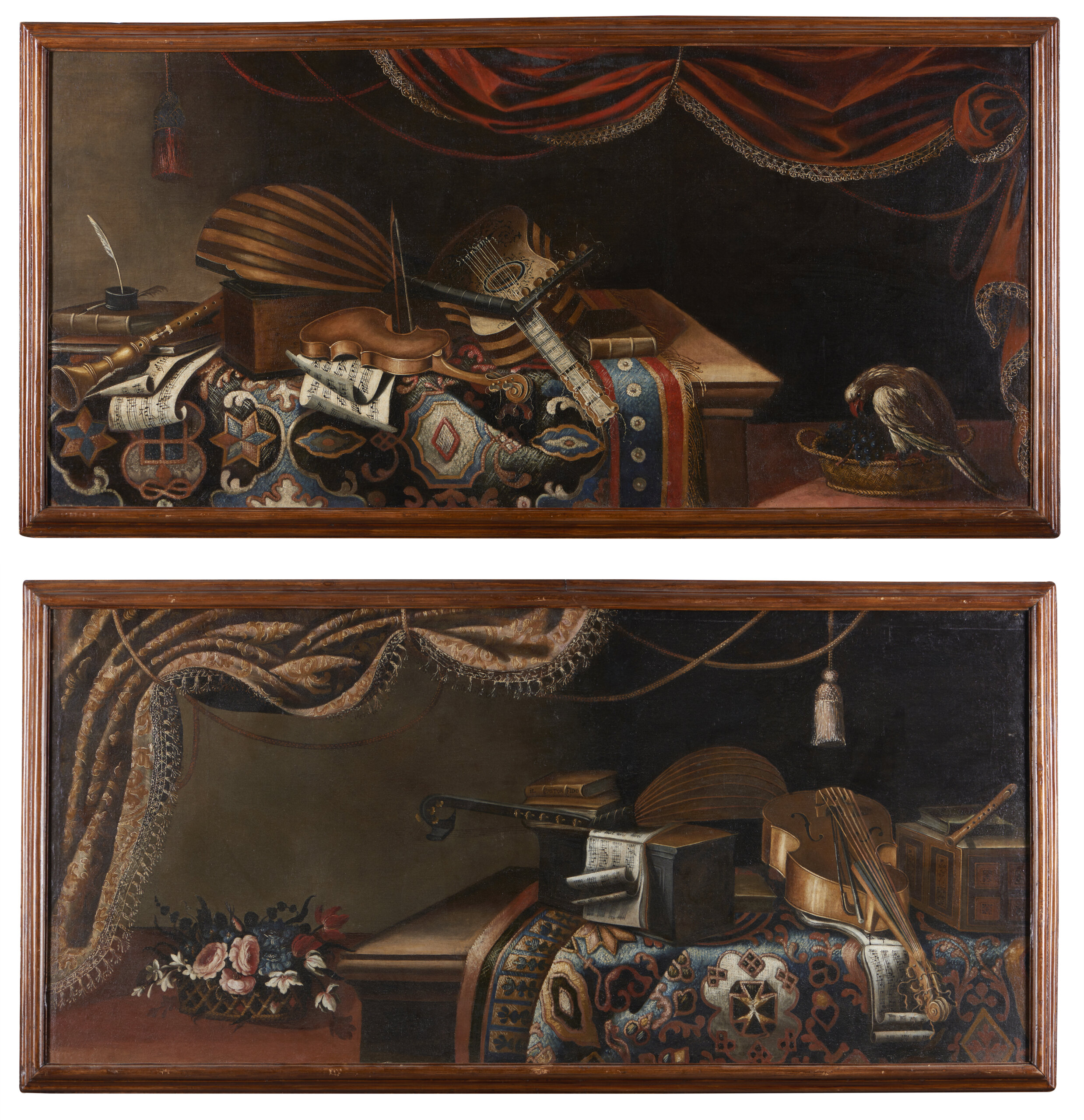 The other depicting a composition with lute, violin, flute, score of "Il Pastor Fido", basket of flowers, carpet and drapery