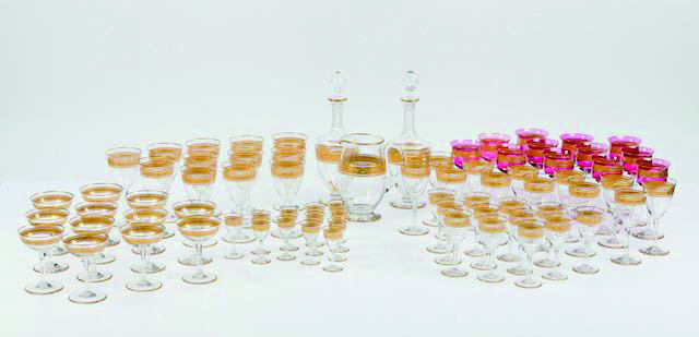 12 water, 12 red wine, 12 white wine, 12 liqueur, 12 champagne and 12 tall glasses with pink cups, 1 jug and two bottles and covers