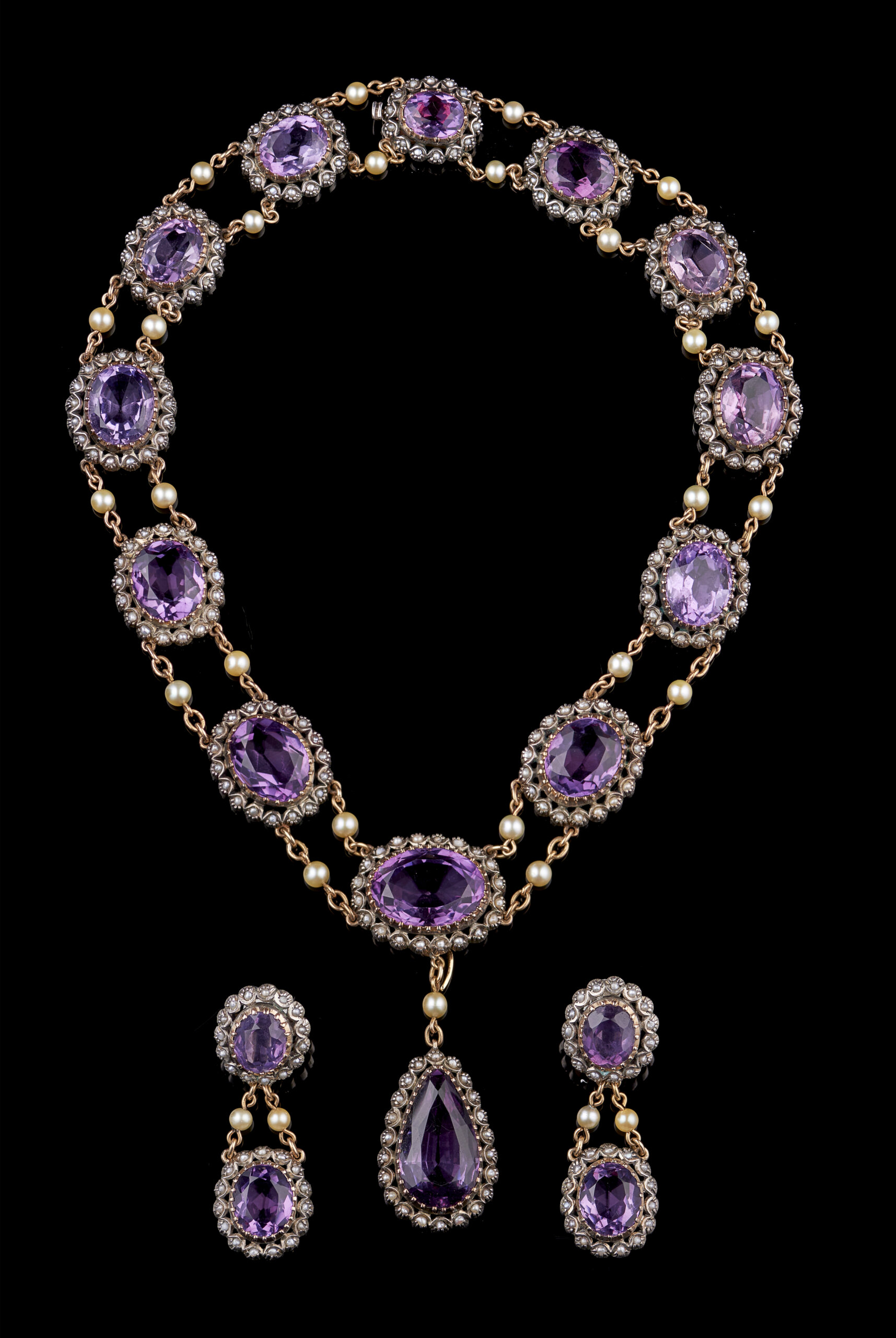 Gold and silver set with 16 oval cut and one drop cut amethyst, demi pearls and cultured pearls